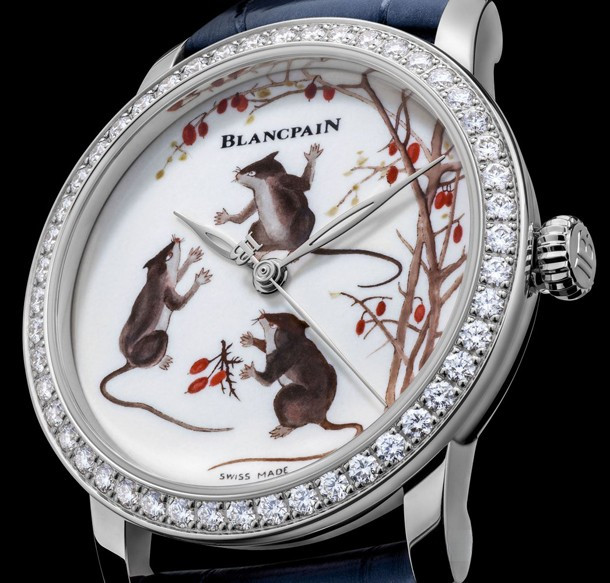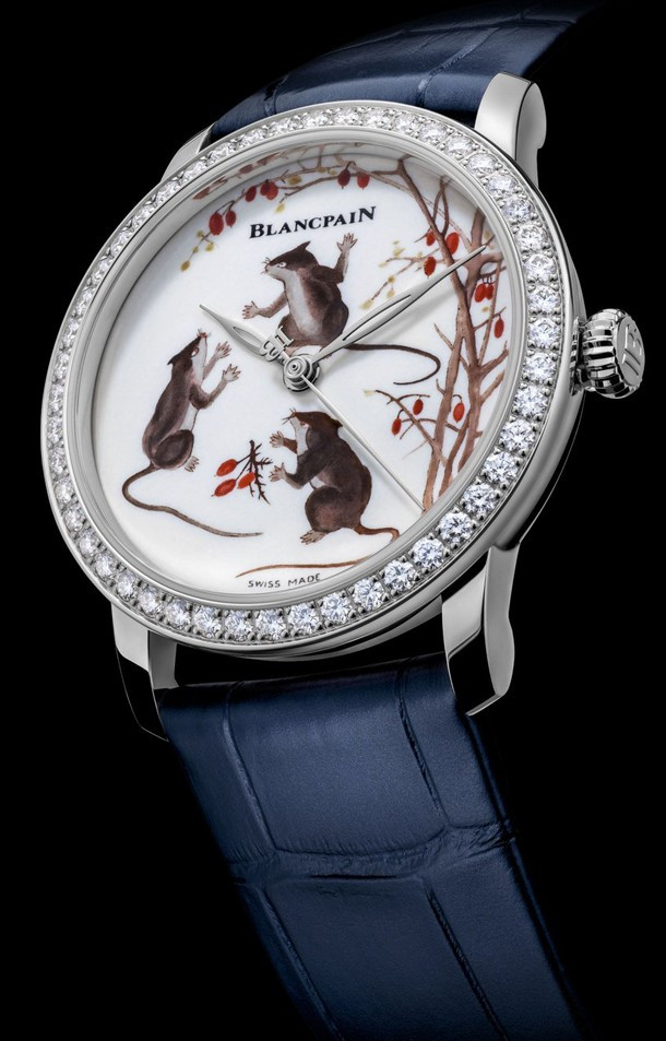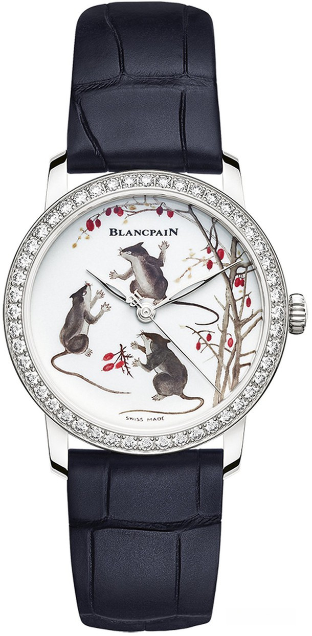 Часы Blancpain Metiers d’Art Porcelaine выпущены в корпусе из белого золота 18к размером 33.2 х 9.15 мм водонепроницаемостью 30 метров. Внутри корпуса установлен автоматический механизм, Калибр 1154, обладающий запасом хода 100 часов. На белом циферблате с мотивом 'крысы' отображаюися часы, минуты, секунды. Часы поставляются на ремешке из кожи аллигатора с вставкой из белого золота 18к. Безель из белых бриллиантов. Серия ограничена - 1 шт.