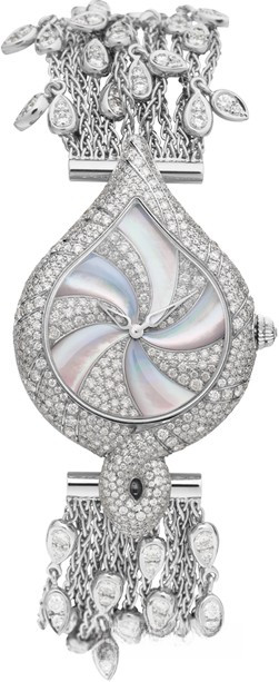 Часы Blancpain Mille et Une Nuits представлены в уникальном корпусе каплевидной формы из белого золота 18к и водонепроницаемостью до 30 метров. Корпус инкрустирован белыми бриллиантами. Часы комплектуются золотым браслетом с белыми бриллиантами. На белом жемчужном циферблате с белыми бриллиантами отображаются часы и минуты. Внутри корпуса установлен автоматический механизм с запасом хода 40 часов.