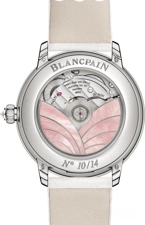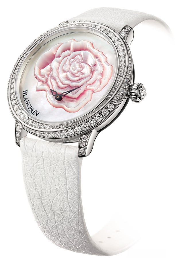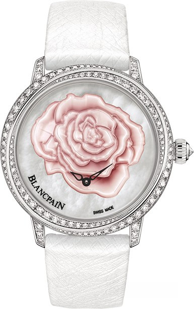 Модель имеет перламутровый циферблат, инкрустированный величественной розой в технике, которая демонстрируют высочайший профессионализм часовых мастеров Blancpain. Инкрустация на циферблате была выполнена с большим тщанием, и каждый лепесток изваян из белого перламутра. Затем готовая рельефная роза была вырезана и покрашена перед помещением на циферблат. Разная толщина перламутра и его прозрачность обеспечивают игру цвета и создают тонкую палитру розовых оттенков. Корпус из белого золота диаметром 36,8 мм переливается 121 бриллиантом. Два переплетающихся ряда камней различного размера напоминают фирменный канонический двухступенчатый дизайн безеля. Бриллианты на ушках и заводной головке завершают гармоничную эстетику дизайна. Сердцем этой оригинальной двухстрелочной модели является смещенный от центра часовой механизм, характерное усложнение для женской коллекции марки. С обратной стороны часов инкрустация из розового перламутра на роторе автоподзавода вторит дизайну циферблата. Все модели из этой лимитированной серии из 14 номерных часов снабжены белым ремешком из кожи страуса.