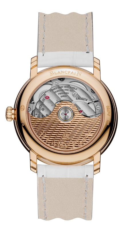 Часы Blancpain Women`s Collection Ultra-Slim Date 6604-2944-55A выпущены в круглом корпусе из розового золота, 18к. Размер составляет 34 х 9,5 мм, водонепроницаемость 50 м, часы с безелем из белых бриллиантов 1 ct. Внутри корпуса установлен автоматический механизм, Калибр Blancpain 1150, обеспечивающий запас хода 100 часов. На белом жемчужном гильошированном циферблате с 8-ю белыми бриллиантами отображаются часы, минуты, секунды, дата. Часы комплектуются ремешком из кожи аллигатора с вставкой из розового золота, 18к.
