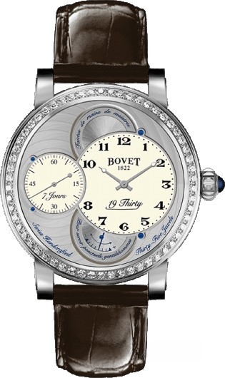 Вдохновленные старинными карманными часами собственного производства, Bovet представили набор великолепных изысканных моделей "19Thirty", которые являются основой совершенно новой коллекции мануфактуры. Вдохновленная на создание ранним периодом 20-го века "когда большинство часов постепенно переходили из карманов на запястья". Корпус часов изготовлен из нержавеющей стали. Коллекция характеризуется двумя различными корпусами размером 42 х 9 мм: более традиционный корпус Dimier и корпус Fleurier, заводная головка и изгиб которого в позиции 12 часов напоминают о моделях начала истории Bovet. Коллекционерам предоставляется циферблат на выбор: черный, синий или цвета слоновой кости с арабскими, римскими или китайскими цифрами, которые вносят свою лепту истории в циферблаты Bovet. Часы работают при помощи совершенно нового мануфактурного Калибра, созданного часовщиками и мастерами Dimier 1738 (дочерняя компания Bovet, которая разрабатывает часовые механизмы). Механический Калибр 15BM04 с одним барабаном и ручным заводом имеет надежный семидневный запас хода и виден сквозь сапфировое стекло задней части корпуса. Он выделяется красивой симметрией и отделкой и выглядит не менее изысканно, чем лицевая сторона часов. Безель из 66-ти белых бриллиантов общим весом 1.1 ct.