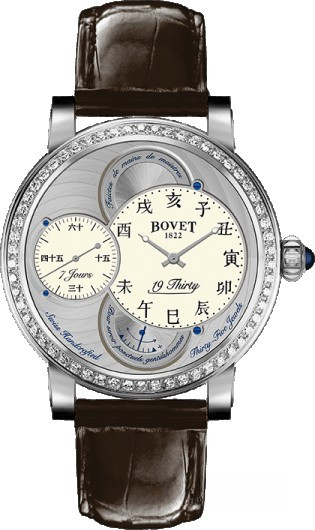 Вдохновленные старинными карманными часами собственного производства, Bovet представили набор великолепных изысканных моделей "19Thirty", которые являются основой совершенно новой коллекции мануфактуры. Вдохновленная на создание ранним периодом 20-го века "когда большинство часов постепенно переходили из карманов на запястья". Корпус часов изготовлен из нержавеющей стали. Коллекция характеризуется двумя различными корпусами размером 42 х 9 мм: более традиционный корпус Dimier и корпус Fleurier, заводная головка и изгиб которого в позиции 12 часов напоминают о моделях начала истории Bovet. Коллекционерам предоставляется циферблат на выбор: черный, синий или цвета слоновой кости с арабскими, римскими или китайскими цифрами, которые вносят свою лепту истории в циферблаты Bovet. Часы работают при помощи совершенно нового мануфактурного Калибра, созданного часовщиками и мастерами Dimier 1738 (дочерняя компания Bovet, которая разрабатывает часовые механизмы). Механический Калибр 15BM04 с одним барабаном и ручным заводом имеет надежный семидневный запас хода и виден сквозь сапфировое стекло задней части корпуса. Он выделяется красивой симметрией и отделкой и выглядит не менее изысканно, чем лицевая сторона часов. Безель из 66-ти белых бриллиантов общим весом 1.1 ct.