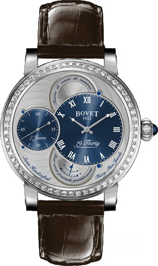 Вдохновленные старинными карманными часами собственного производства, Bovet представили набор великолепных изысканных моделей "19Thirty", которые являются основой совершенно новой коллекции мануфактуры. Вдохновленная на создание ранним периодом 20-го века "когда большинство часов постепенно переходили из карманов на запястья". Корпус часов изготовлен из нержавеющей стали. Коллекция характеризуется двумя различными корпусами размером 42 х 9 мм: более традиционный корпус Dimier и корпус Fleurier, заводная головка и изгиб которого в позиции 12 часов напоминают о моделях начала истории Bovet. Коллекционерам предоставляется циферблат на выбор: черный, синий или цвета слоновой кости с арабскими, римскими или китайскими цифрами, которые вносят свою лепту истории в циферблаты Bovet. Часы работают при помощи совершенно нового мануфактурного Калибра, созданного часовщиками и мастерами Dimier 1738 (дочерняя компания Bovet, которая разрабатывает часовые механизмы). Механический Калибр 15BM04 с одним барабаном и ручным заводом имеет надежный семидневный запас хода и виден сквозь сапфировое стекло задней части корпуса. Он выделяется красивой симметрией и отделкой и выглядит не менее изысканно, чем лицевая сторона часов. Безель из 66-ти белых бриллиантов общим весом 1.1 ct.