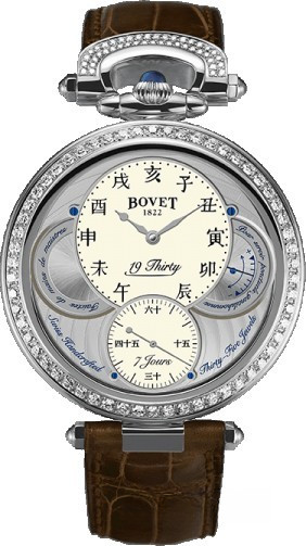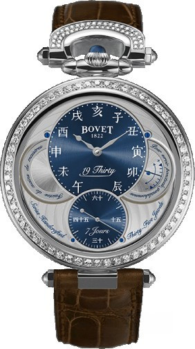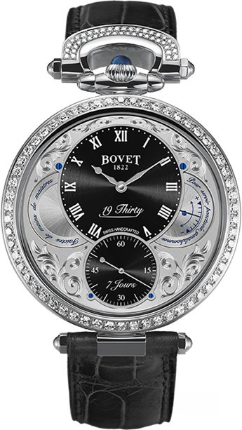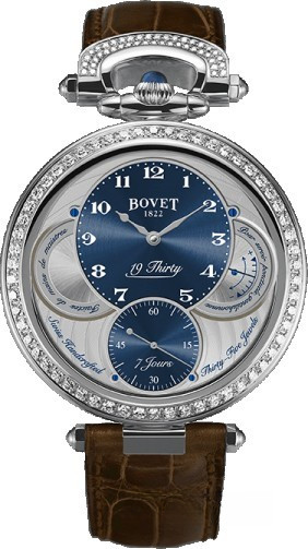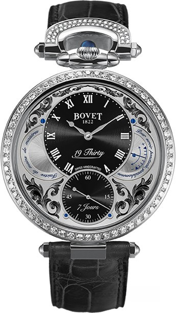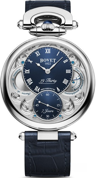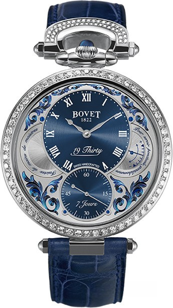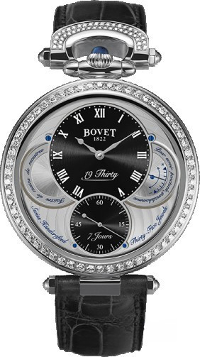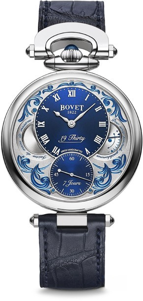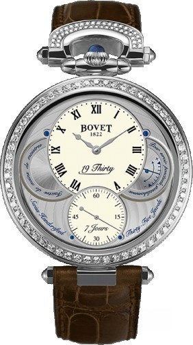 Вдохновленные старинными карманными часами собственного производства, Bovet представили набор великолепных изысканных моделей "19Thirty", которые являются основой совершенно новой коллекции мануфактуры. Вдохновленная на создание ранним периодом 20-го века "когда большинство часов постепенно переходили из карманов на запястья". Корпус часов изготовлен из розового золота 18к. Коллекция характеризуется двумя различными корпусами размером 42 х 9 мм: более традиционный корпус Dimier и корпус Fleurier, заводная головка и изгиб которого в позиции 12 часов напоминают о моделях начала истории Bovet. Коллекционерам предоставляется циферблат на выбор: черный, синий или цвета слоновой кости с арабскими, римскими или китайскими цифрами, которые вносят свою лепту истории в циферблаты Bovet. Часы работают при помощи совершенно нового мануфактурного Калибра, созданного часовщиками и мастерами Dimier 1738 (дочерняя компания Bovet, которая разрабатывает часовые механизмы). Механический Калибр 15BM04 с одним барабаном и ручным заводом имеет надежный семидневный запас хода и виден сквозь сапфировое стекло задней части корпуса. Он выделяется красивой симметрией и отделкой и выглядит не менее изысканно, чем лицевая сторона часов. Корпус инкрустирован 114-ю белыми бриллиантами общим весом 1.37 ct.