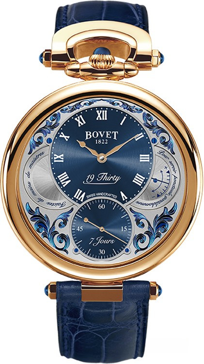 Вдохновленные старинными карманными часами собственного производства, Bovet представили набор великолепных изысканных моделей "19Thirty", которые являются основой совершенно новой коллекции мануфактуры. Вдохновленная на создание ранним периодом 20-го века "когда большинство часов постепенно переходили из карманов на запястья". Корпус часов изготовлен из розового золота 18к. Коллекция характеризуется корпусом размером 42 х 9 мм. Циферблат синий. Часы работают при помощи совершенно нового мануфактурного Калибра, созданного часовщиками и мастерами Dimier 1738 (дочерняя компания Bovet, которая разрабатывает часовые механизмы). Механический Калибр 15BM04 с одним барабаном и ручным заводом имеет надежный семидневный запас хода и виден сквозь сапфировое стекло задней части корпуса. Он выделяется красивой симметрией и отделкой и выглядит не менее изысканно, чем лицевая сторона часов.