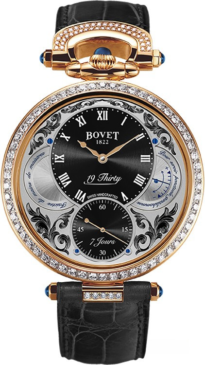 Вдохновленные старинными карманными часами собственного производства, Bovet представили набор великолепных изысканных моделей "19Thirty", которые являются основой совершенно новой коллекции мануфактуры. Вдохновленная на создание ранним периодом 20-го века "когда большинство часов постепенно переходили из карманов на запястья". Корпус часов изготовлен из розового золота 18к. Коллекция характеризуется корпусом размером 42 х 9 мм. Циферблат черный. Часы работают при помощи совершенно нового мануфактурного Калибра, созданного часовщиками и мастерами Dimier 1738 (дочерняя компания Bovet, которая разрабатывает часовые механизмы). Механический Калибр 15BM04 с одним барабаном и ручным заводом имеет надежный семидневный запас хода и виден сквозь сапфировое стекло задней части корпуса. Он выделяется красивой симметрией и отделкой и выглядит не менее изысканно, чем лицевая сторона часов. Корпус инкрустирован белыми бриллиантами.