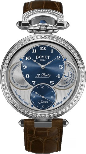 Вдохновленные старинными карманными часами собственного производства, Bovet представили набор великолепных изысканных моделей "19Thirty", которые являются основой совершенно новой коллекции мануфактуры. Вдохновленная на создание ранним периодом 20-го века "когда большинство часов постепенно переходили из карманов на запястья", коллекция 19Thirty также выделяется тем, что это первая линейка стальных часов бренда. Коллекция характеризуется двумя различными корпусами размером 42 х 9 мм: более традиционный корпус Dimier и корпус Fleurier, заводная головка и изгиб которого в позиции 12 часов напоминают о моделях начала истории Bovet. В дополнение к выбору одного из двух стальных корпусов, коллекционерам также предоставляется набор циферблатов: черный, синий или цвета слоновой кости с арабскими, римскими или китайскими цифрами, которые вносят свою лепту истории в циферблаты Bovet. Часы работают при помощи совершенно нового мануфактурного Калибра, созданного часовщиками и мастерами Dimier 1738 (дочерняя компания Bovet, которая разрабатывает часовые механизмы). Механический Калибр 15BM04 с одним барабаном и ручным заводом имеет надежный семидневный запас хода и виден сквозь сапфировое стекло задней части корпуса. Он выделяется красивой симметрией и отделкой и выглядит не менее изысканно, чем лицевая сторона часов. Корпус инкрустирован 109-ю белыми бриллиантами общим весом 1.31 ct.