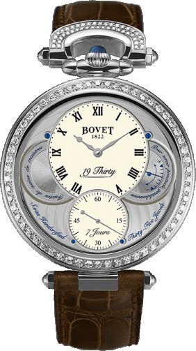 Вдохновленные старинными карманными часами собственного производства, Bovet представили набор великолепных изысканных моделей "19Thirty", которые являются основой совершенно новой коллекции мануфактуры. Вдохновленная на создание ранним периодом 20-го века "когда большинство часов постепенно переходили из карманов на запястья", коллекция 19Thirty также выделяется тем, что это первая линейка стальных часов бренда. Коллекция характеризуется двумя различными корпусами размером 42 х 9 мм: более традиционный корпус Dimier и корпус Fleurier, заводная головка и изгиб которого в позиции 12 часов напоминают о моделях начала истории Bovet. В дополнение к выбору одного из двух стальных корпусов, коллекционерам также предоставляется набор циферблатов: черный, синий или цвета слоновой кости с арабскими, римскими или китайскими цифрами, которые вносят свою лепту истории в циферблаты Bovet. Часы работают при помощи совершенно нового мануфактурного Калибра, созданного часовщиками и мастерами Dimier 1738 (дочерняя компания Bovet, которая разрабатывает часовые механизмы). Механический Калибр 15BM04 с одним барабаном и ручным заводом имеет надежный семидневный запас хода и виден сквозь сапфировое стекло задней части корпуса. Он выделяется красивой симметрией и отделкой и выглядит не менее изысканно, чем лицевая сторона часов. Корпус инкрустирован 109-ю белыми бриллиантами общим весом 1.31 ct.