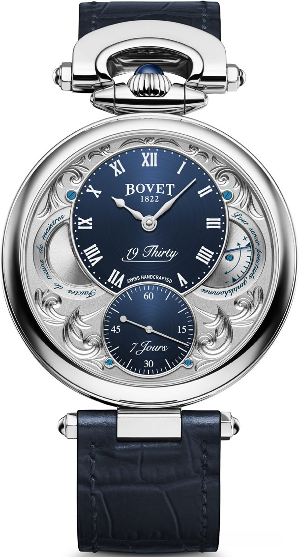 Вдохновленные старинными карманными часами собственного производства, Bovet представили набор великолепных изысканных моделей "19Thirty", которые являются основой совершенно новой коллекции мануфактуры. Вдохновленная на создание ранним периодом 20-го века "когда большинство часов постепенно переходили из карманов на запястья". Корпус часов изготовлен из нержавеющей стали. Коллекция характеризуется двумя различными корпусами размером 42 х 9 мм: более традиционный корпус Dimier и корпус Fleurier, заводная головка и изгиб которого в позиции 12 часов напоминают о моделях начала истории Bovet. Циферблат синий. Часы работают при помощи совершенно нового мануфактурного Калибра, созданного часовщиками и мастерами Dimier 1738 (дочерняя компания Bovet, которая разрабатывает часовые механизмы). Механический Калибр 11BM04 с одним барабаном и ручным заводом имеет надежный семидневный запас хода и виден сквозь сапфировое стекло задней части корпуса. Он выделяется красивой симметрией и отделкой и выглядит не менее изысканно, чем лицевая сторона часов.