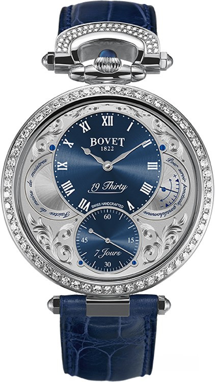 Вдохновленные старинными карманными часами собственного производства, Bovet представили набор великолепных изысканных моделей "19Thirty", которые являются основой совершенно новой коллекции мануфактуры. Вдохновленная на создание ранним периодом 20-го века "когда большинство часов постепенно переходили из карманов на запястья". Корпус часов изготовлен из нержавеющей стали. Коллекция характеризуется корпусом размером 42 х 9 мм. Циферблат синий. Часы работают при помощи совершенно нового мануфактурного Калибра, созданного часовщиками и мастерами Dimier 1738 (дочерняя компания Bovet, которая разрабатывает часовые механизмы). Механический Калибр 15BM04 с одним барабаном и ручным заводом имеет надежный семидневный запас хода и виден сквозь сапфировое стекло задней части корпуса. Он выделяется красивой симметрией и отделкой и выглядит не менее изысканно, чем лицевая сторона часов. Корпус инкрустирован белыми бриллиантами.