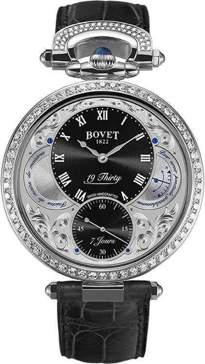 Вдохновленные старинными карманными часами собственного производства, Bovet представили набор великолепных изысканных моделей "19Thirty", которые являются основой совершенно новой коллекции мануфактуры. Вдохновленная на создание ранним периодом 20-го века "когда большинство часов постепенно переходили из карманов на запястья". Корпус часов изготовлен из нержавеющей стали. Коллекция характеризуется корпусом размером 42 х 9 мм. Циферблат черный. Часы работают при помощи совершенно нового мануфактурного Калибра, созданного часовщиками и мастерами Dimier 1738 (дочерняя компания Bovet, которая разрабатывает часовые механизмы). Механический Калибр 15BM04 с одним барабаном и ручным заводом имеет надежный семидневный запас хода и виден сквозь сапфировое стекло задней части корпуса. Он выделяется красивой симметрией и отделкой и выглядит не менее изысканно, чем лицевая сторона часов. Корпус инкрустирован белыми бриллиантами.
