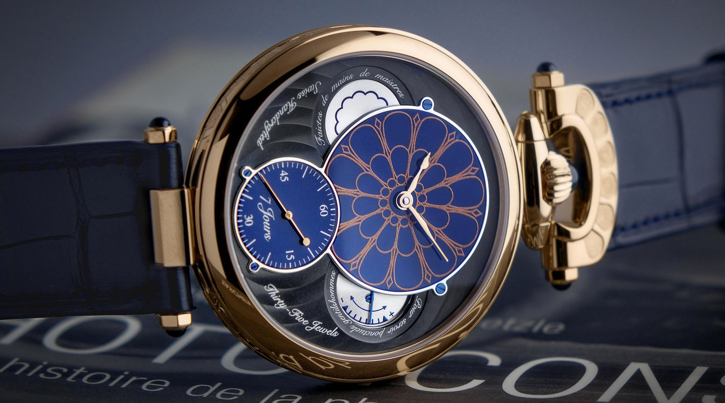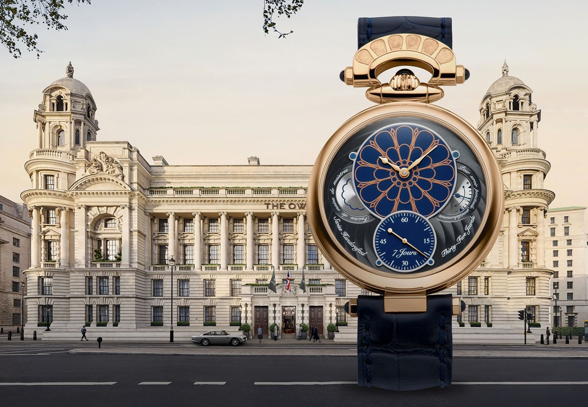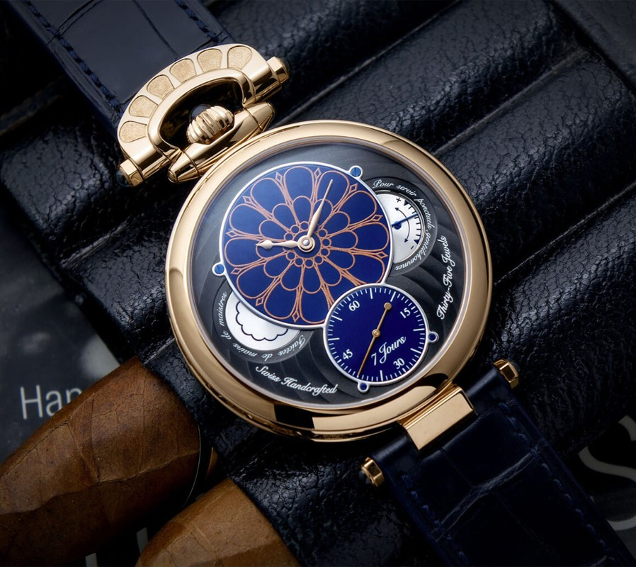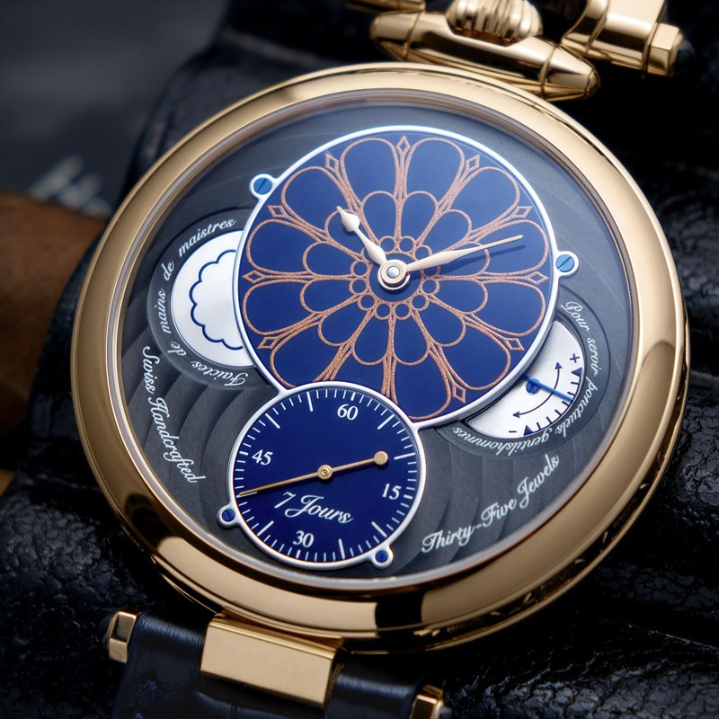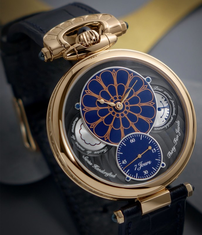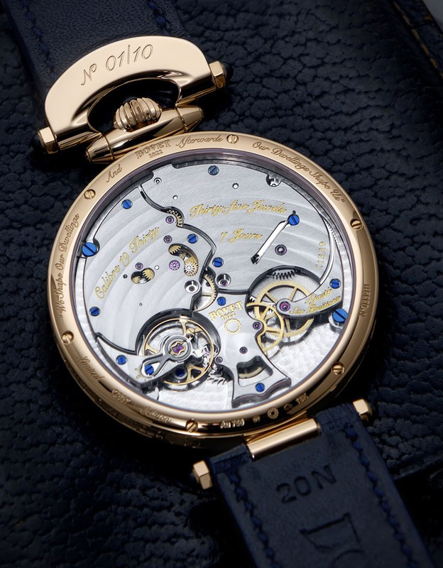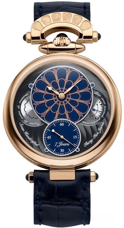 Часы Bovet 19Thirty Owo представлены в корпусе размером 42 х 9.05 мм из розового золота 18к водонепроницаемостью 30 метров. Внутри корпуса установлен механизм с ручным заводом, Калибр 15BM04, обладающий запасом хода 7 дней. На синем циферблате отображаются часы, минуты, секунды, запас хода. Часы поставляются на ремешке из кожи аллигатора с золотой застежкой. Серия ограничена - 10 шт.