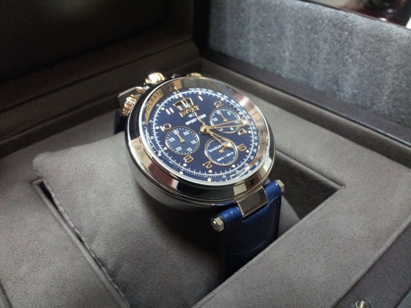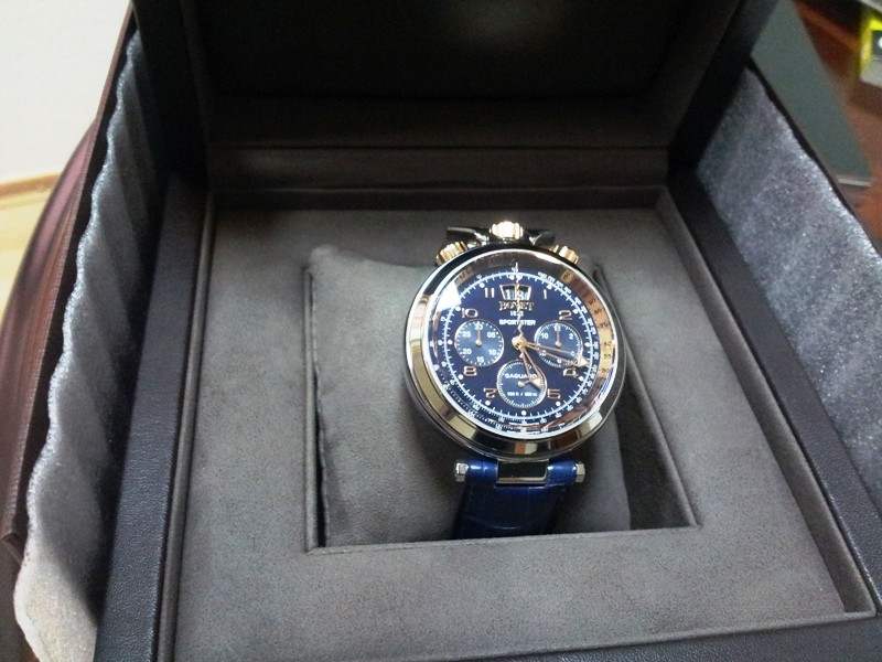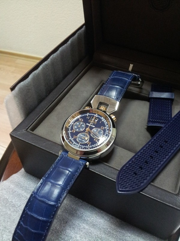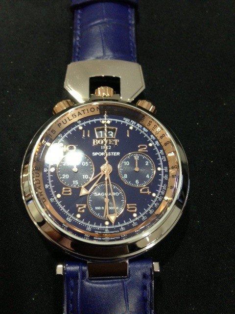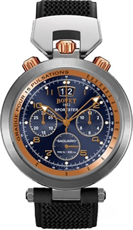 Модель часов Saguaro Chronograph изготовлена из нержавеющей стали и розового золота 18к, размер корпуса составляет 46 мм, водонепроницаемость до 300 метров. Внутри корпуса установлен автоматический механизм 13BA01 с запасом хода 42 часа, который является сертифицированным хронометром. На синем циферблате отображаются часы, минуты, секунды, дата и пульсомер. Накопители хронографа расположены на 3-х и 9-ти часах, увеличенная дата находится в позиции 12-ти часов. Часы комплектуются каучуковым ремешком с вставкой из нержавеющей стали.