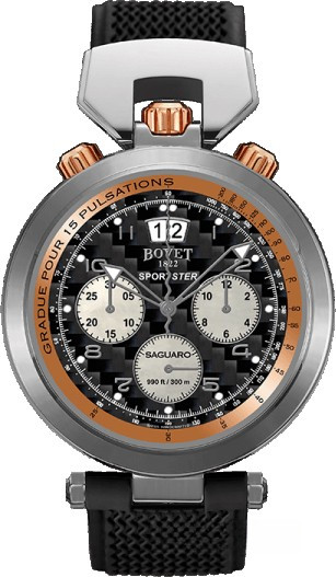 Модель часов Saguaro Chronograph изготовлена из нержавеющей стали, размер корпуса составляет 46 мм, водонепроницаемость до 300 метров. Внутри корпуса установлен автоматический механизм 13BA01 с запасом хода 42 часа, который является сертифицированным хронометром. На черном карбоновом с серебристыми накопителями хронографа циферблате отображаются часы, минуты, секунды, дата и пульсомер. Накопители хронографа расположены на 3-х и 9-ти часах, увеличенная дата находится в позиции 12-ти часов. Часы комплектуются каучуковым ремешком с вставкой из нержавеющей стали.