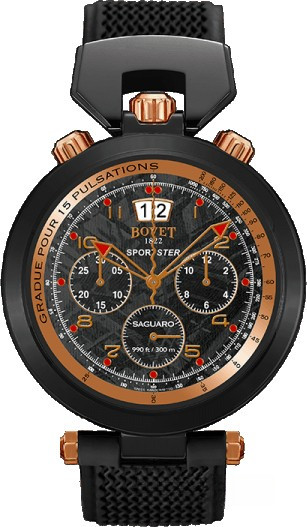 Модель часов Saguaro Chronograph изготовлена из нержавеющей стали с черным покрытием DLC, размер корпуса составляет 46 мм, водонепроницаемость до 300 метров. Внутри корпуса установлен автоматический механизм 13BA01 с запасом хода 42 часа, который является сертифицированным хронометром. На черном метеоритном циферблате отображаются часы, минуты, секунды, дата и пульсомер. Накопители хронографа расположены на 3-х и 9-ти часах, увеличенная дата находится в позиции 12-ти часов. Часы комплектуются каучуковым ремешком с вставкой из нержавеющей стали.