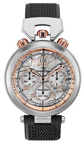 Модель часов Saguaro Chronograph изготовлена из нержавеющей стали и розового золота 18к, размер корпуса составляет 46 мм, водонепроницаемость до 300 метров. Внутри корпуса установлен автоматический механизм 13BA01 с запасом хода 42 часа, который является сертифицированным хронометром. На циферблате цвета белый метеорит отображаются часы, минуты, секунды, дата и пульсомер. Накопители хронографа расположены на 3-х и 9-ти часах, увеличенная дата находится в позиции 12-ти часов. Часы комплектуются каучуковым ремешком с вставкой из нержавеющей стали.