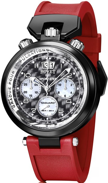Модель часов Saguaro Chronograph изготовлена из нержавеющей стали с покрытием DLC, размер корпуса составляет 46 мм, водонепроницаемость до 300 метров. Внутри корпуса установлен автоматический механизм 13BA01 с запасом хода 42 часа, который является сертифицированным хронометром. На черном с серебристым циферблате отображаются часы, минуты, секунды, дата и пульсомер. Накопители хронографа расположены на 3-х и 9-ти часах, увеличенная дата находится в позиции 12-ти часов. Часы комплектуются каучуковым ремешком с вставкой из нержавеющей стали.