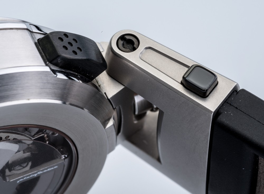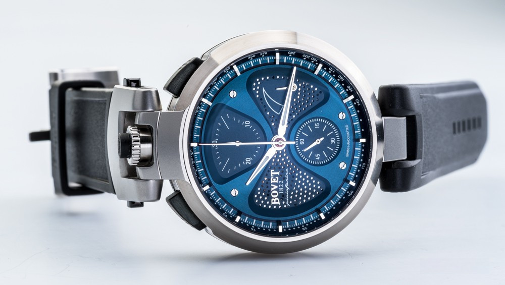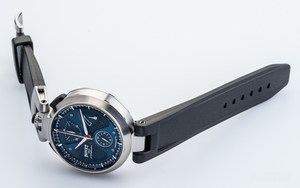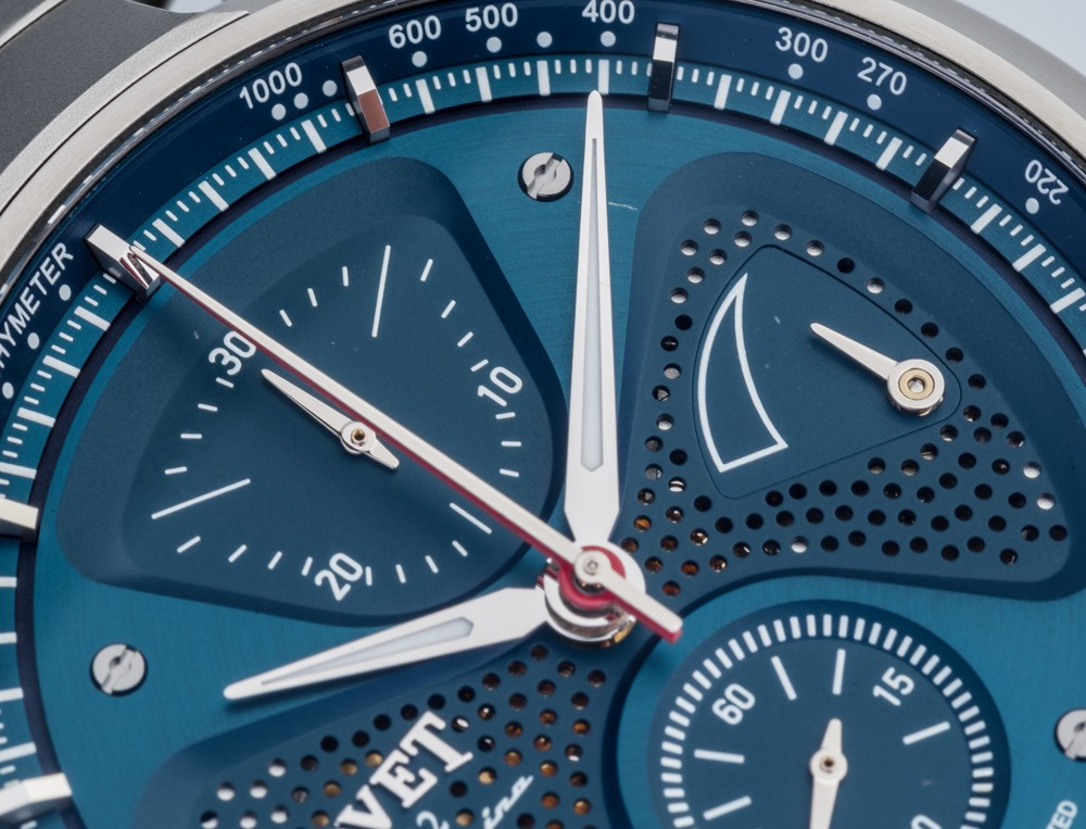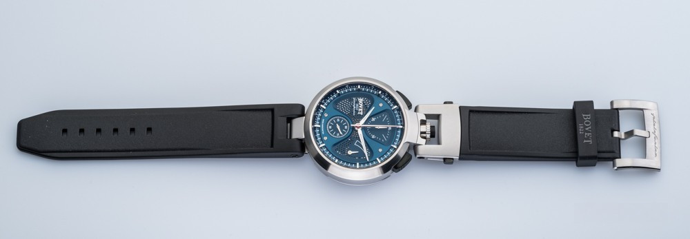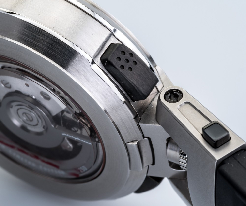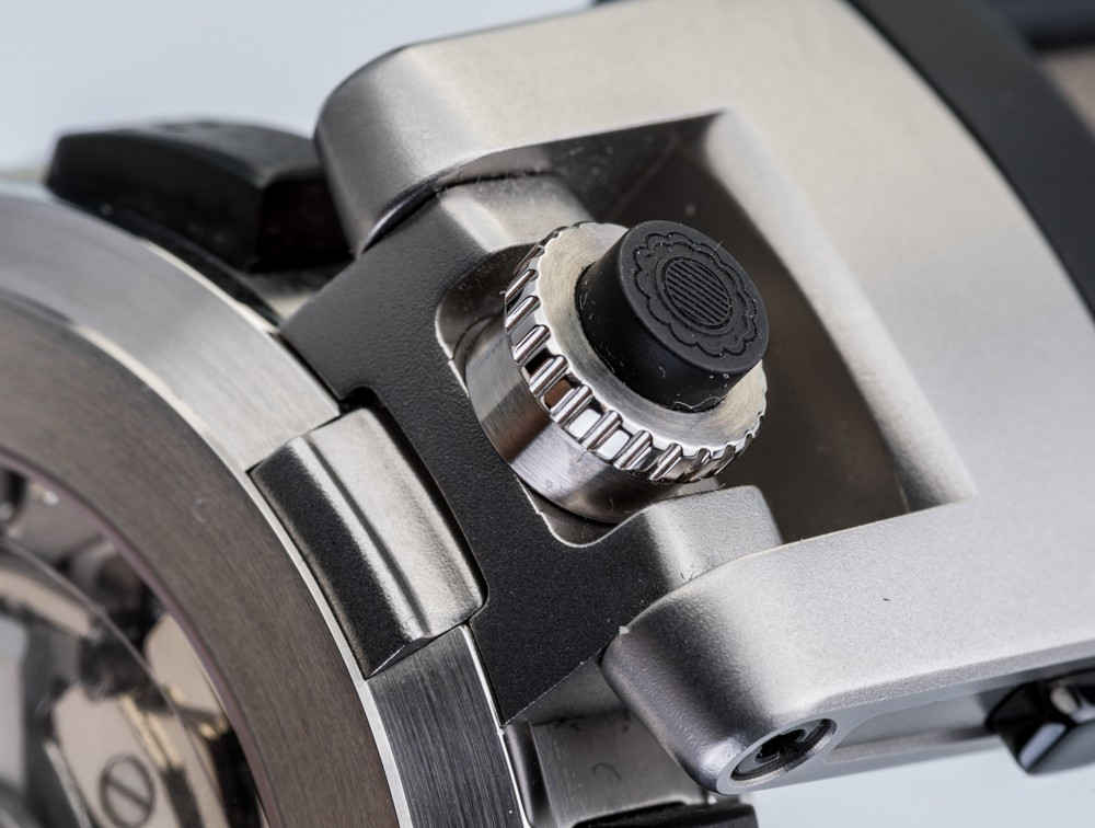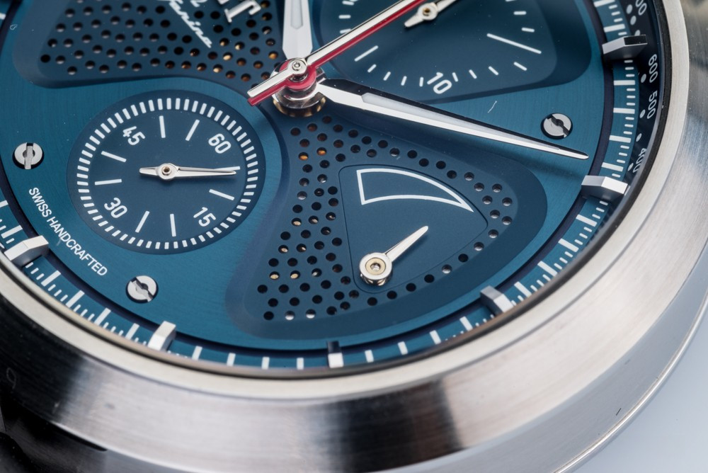 Мужские часы Split-Second Chronograph 45 выпущены в корпусе из нержавеющей стали с покрытием DLC диаметром 45 мм. Водонепроницаемость корпуса сотавляет 30 метров. Модель выпущена ограниченной серией 250 штук. На синем циферблате расположены индикаторы часов, минут, секунд, запаса хода, а также тахиметр. Внутри установлен мануфактурный автоматический механизм, Калибр 13BA08R с запасом хода 50 часов. Хронограф комплектуется черным каучуковым ремешком с вставкой из нержавеющей стали.