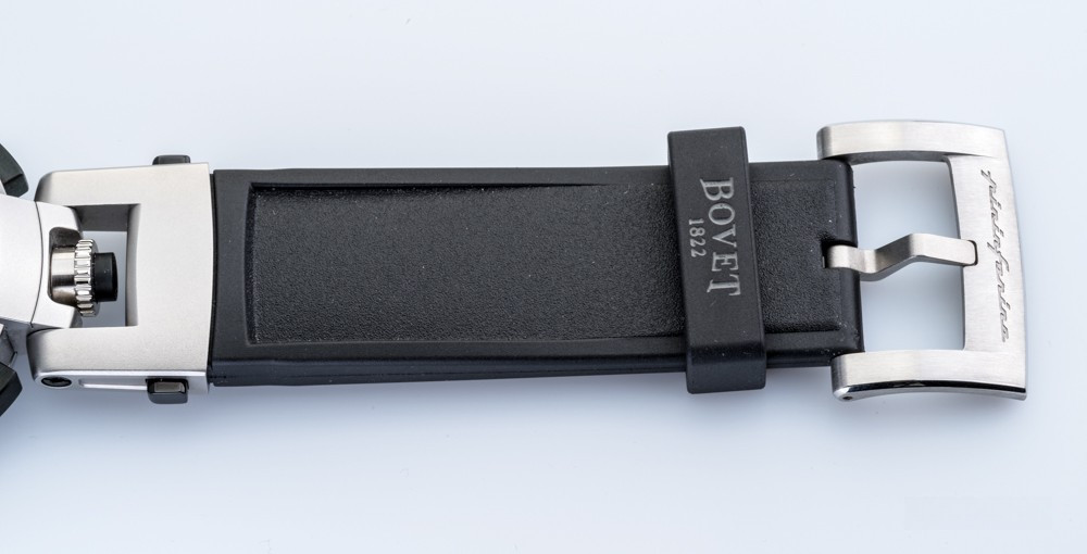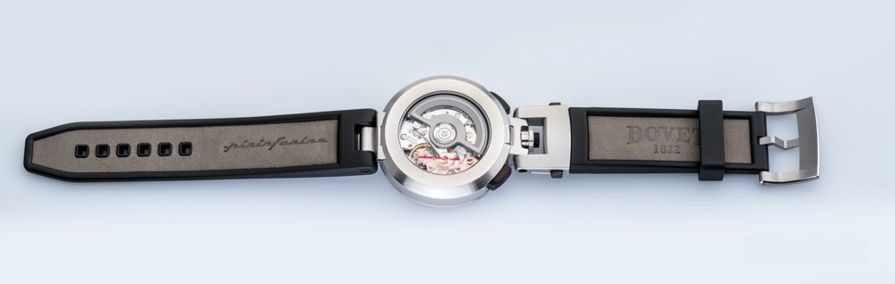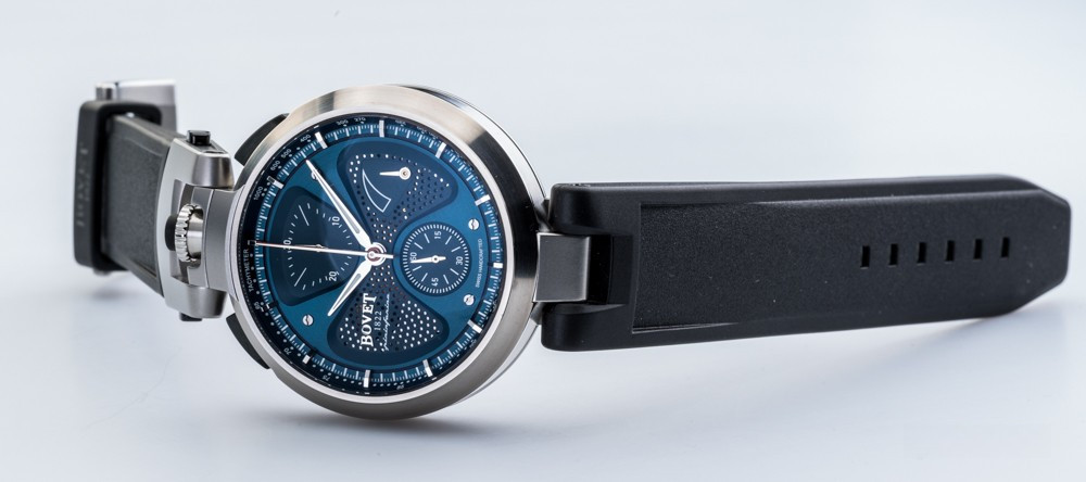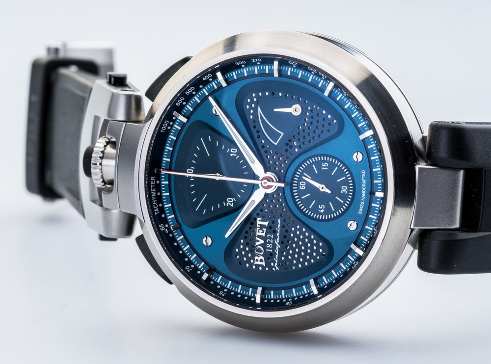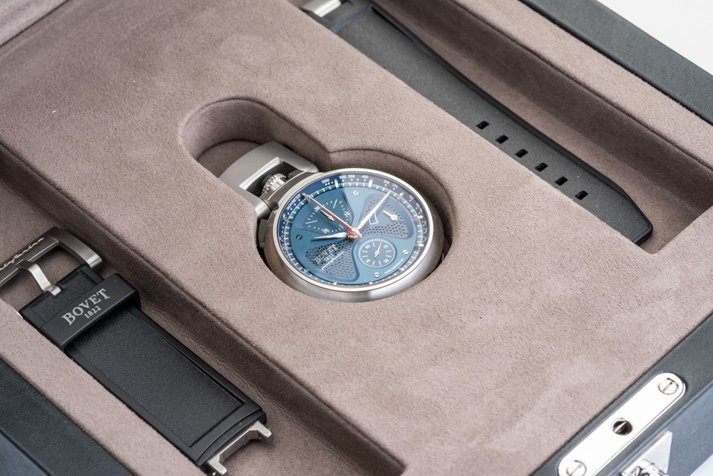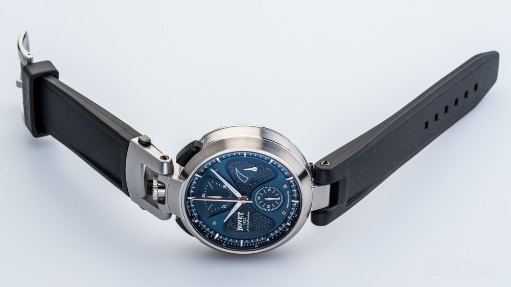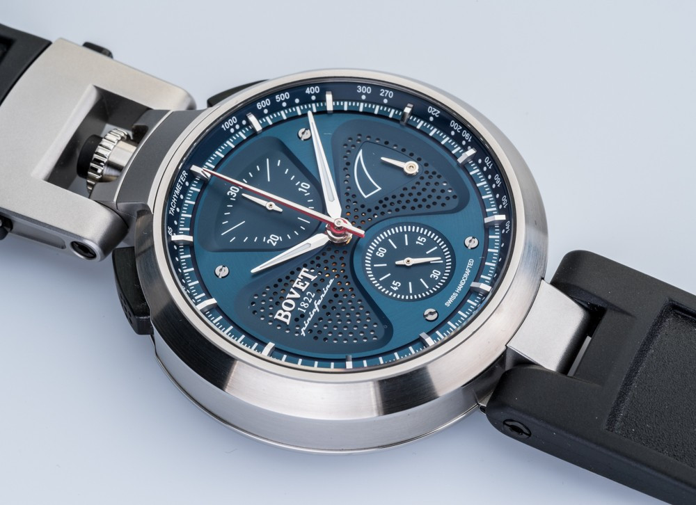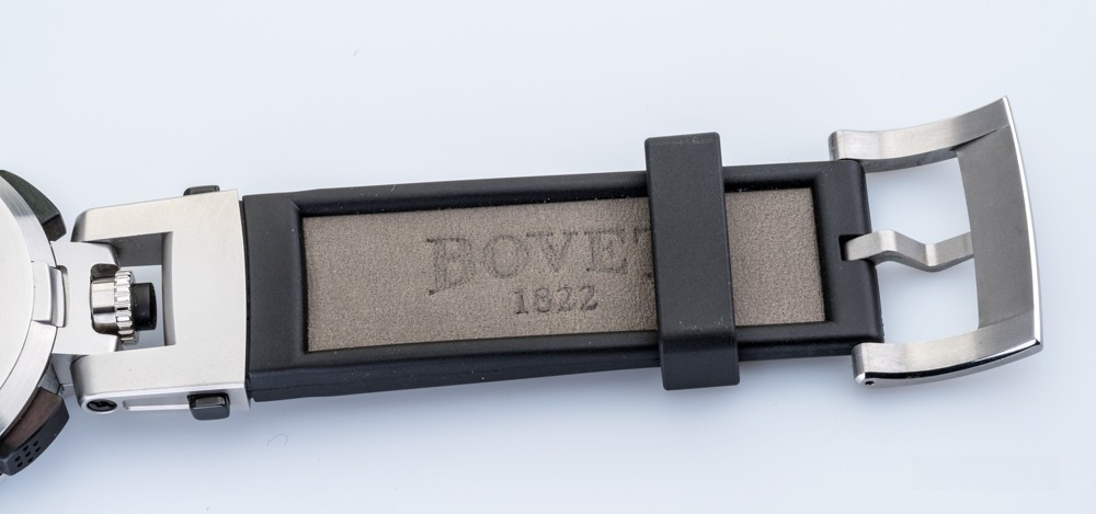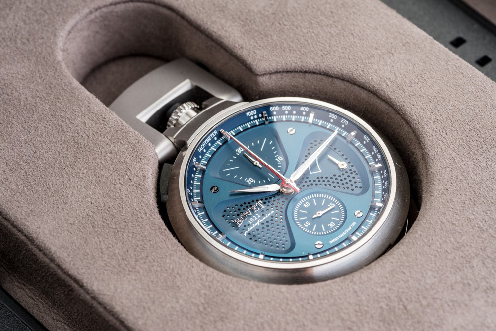Мужские часы Split-Second Chronograph 45 выпущены в корпусе из нержавеющей стали с покрытием DLC диаметром 45 мм. Водонепроницаемость корпуса сотавляет 30 метров. Модель выпущена ограниченной серией 250 штук. На синем циферблате расположены индикаторы часов, минут, секунд, запаса хода, а также тахиметр. Внутри установлен мануфактурный автоматический механизм, Калибр 13BA08R с запасом хода 50 часов. Хронограф комплектуется черным каучуковым ремешком с вставкой из нержавеющей стали.