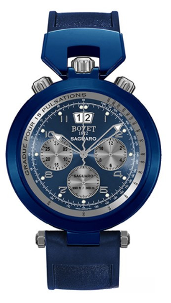 Часы Bovet Sportster Saguaro Chronograph представлены в корпусе размером 46 мм из нержавеющей стали с покрытием PVD водонепроницаемостью 30 метров. Внутри корпуса установлен автоматический механизм. На синем с серебристым циферблате отображаются часы, минуты, секунды, дата, пульсомер. Часы поставляются на каучуковом ремешке с вставкой из нержавеющей стали.