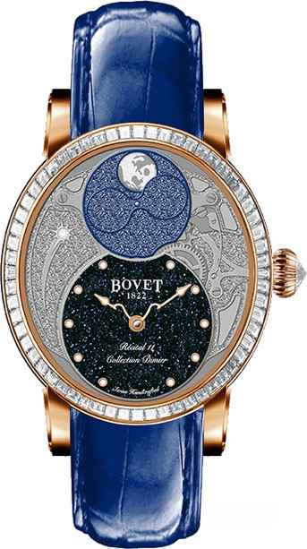 Модель Récital 11 Miss Alexandra точно отображает часы, минуты, лунные фазы. Механические часы с автоподзаводом оснащены Калибром 11DA16-MP с запасом хода 72 часа. Размер корпуса 41 х 37.2 х 11 мм. Корпус часов из 18-каратного розового золота. Циферблат из синего авантюрина с 10-ю белыми бриллиантами. Ремешок из кожи аллигатора с вставкой из розового золота 18к. Водонепроницаемость до 30 м. Безель из белых багетных бриллиантов.