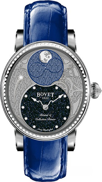 Модель Récital 11 Miss Alexandra точно отображает часы, минуты, лунные фазы. Механические часы с автоподзаводом оснащены Калибром 11DA16-MP с запасом хода 72 часа. Размер корпуса 41 х 37.2 х 11 мм. Корпус часов из 18-каратного белого золота. Циферблат из синего авантюрина с 10-ю белыми бриллиантами. Ремешок из кожи аллигатора с вставкой из белого золота 18к. Водонепроницаемость до 30 м. Безель из белых бриллиантов.