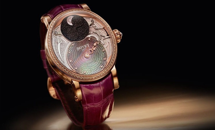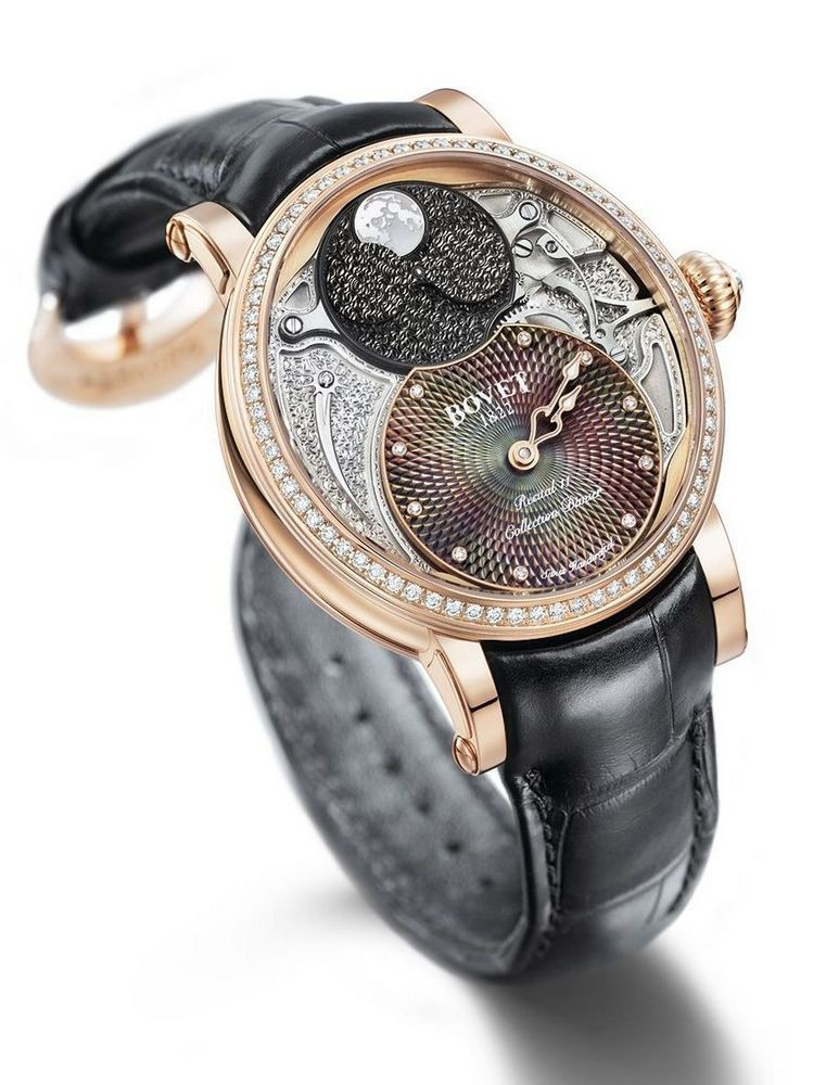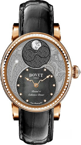 Модель Récital 11 Miss Alexandra точно отображает часы, минуты, лунные фазы. Механические часы с автоподзаводом оснащены Калибром 11DA16-MP с запасом хода 72 часа. Размер корпуса 41 х 37,2 х 11 мм. Корпус часов из 18-каратного розового золота, безель инкрустирован 72-мя багетной огранки бриллиантами на 1 карат. Циферблат черный гильошированный с 10 бриллиантами-метками. Ремешок из черной кожи аллигатора. Водонепроницаемость до 30 м.
