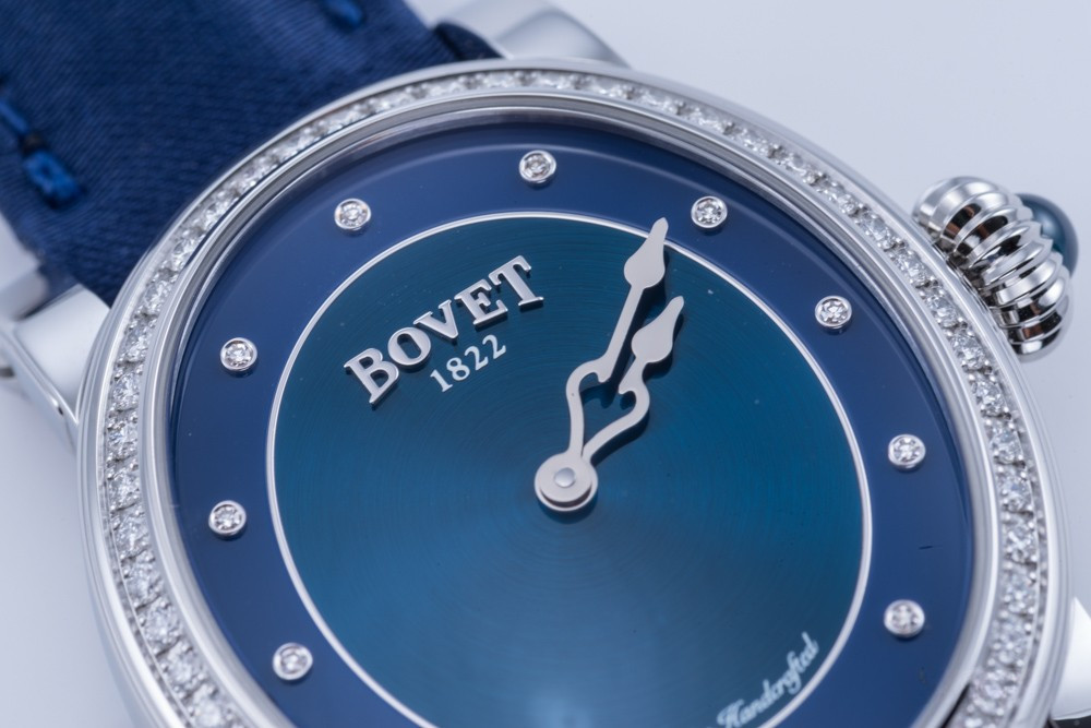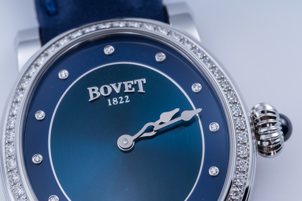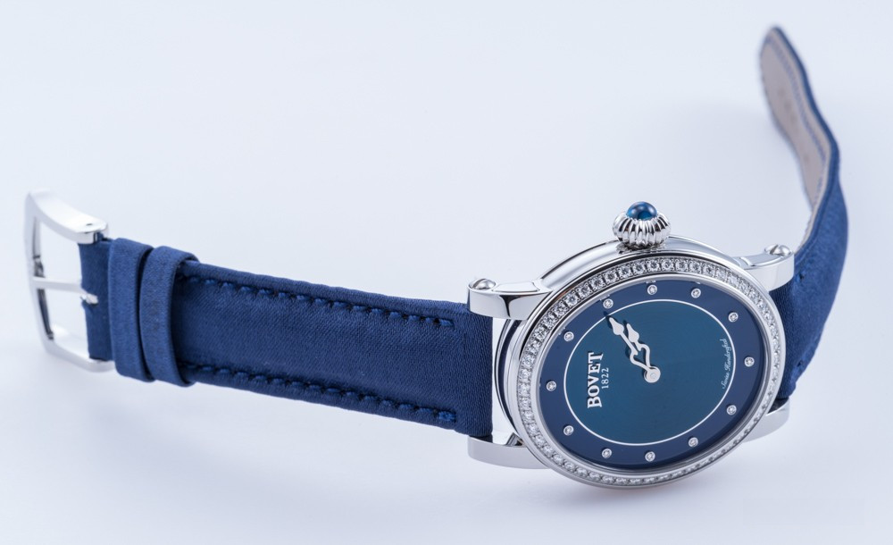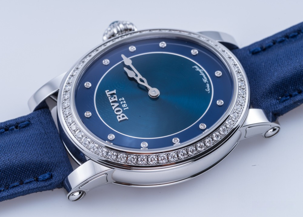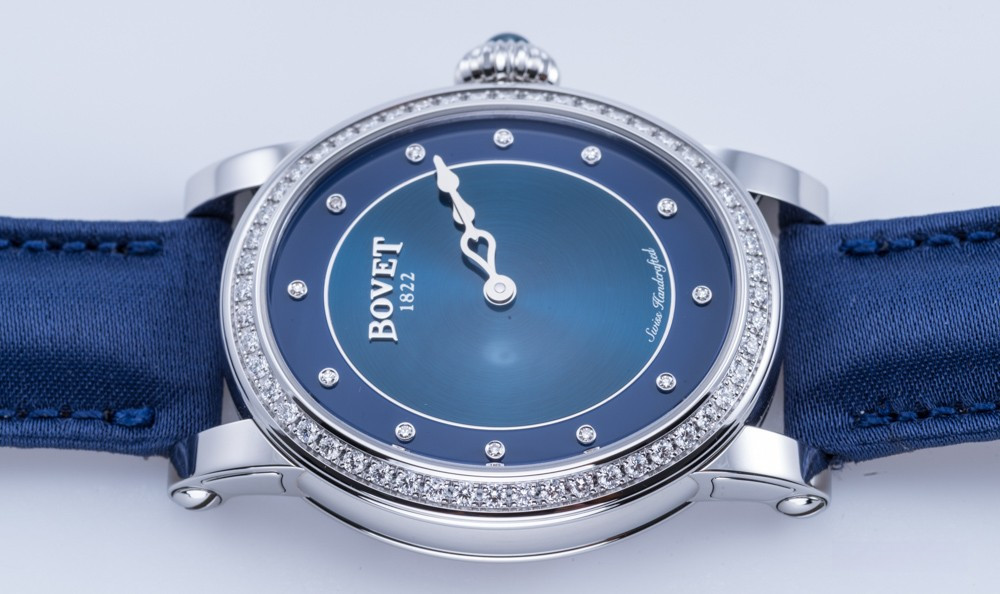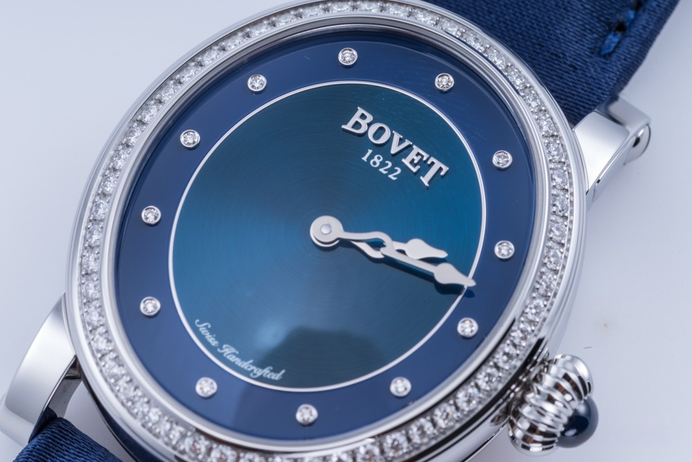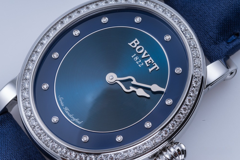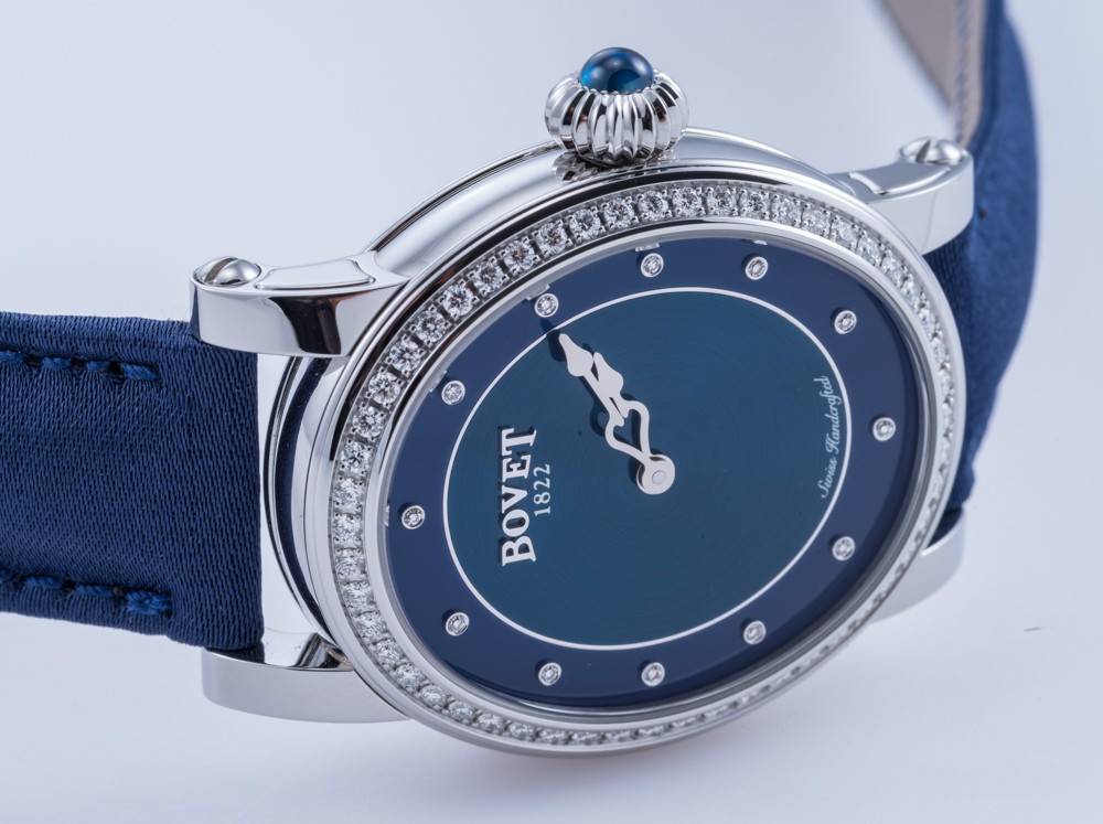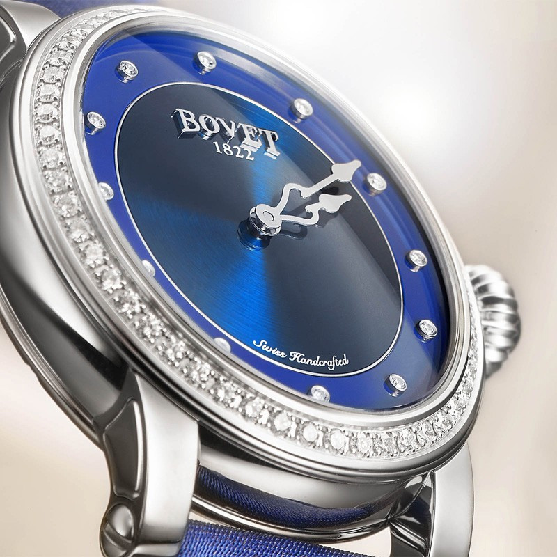 Часы Bovet Recital 19 Miss Dimier представлены в корпусе из стали, женственность которого акцентирована деликатно выполненным безелем с отделкой из 52 бриллиантов. Механизм с автоподзаводом гарантирует 3-дневный запас хода. Высокая частота механизма баланса – 28 800 пк/ч – обеспечивает безупречную точность хода часов, которую в поэтической форме подчеркивают эмблематические стрелки этой коллекции: благодаря своей необычной форме, каждый час, догоняя друг друга, они образуют сердечко. Чередование элегантных плавных линий корпуса в форме вертикального эллипса продолжается на циферблате, который разделен на две зоны, искусно декорированные мастерами мануфактуры BOVET 1822. Центр циферблата украшен в технике кругового сатинирования, на которое затем наносится PVD-покрытие, окрашивающее эту часть в синий цвет. На таким образом подготовленную поверхность накладываются, один за другим, многочисленные слои бесцветного лака традиционным ремесленным методом, который позволяет придать циферблату особую глубину. Для контрастности внешняя часть покрыта непрозрачным синим лаком и украшена 12-ю круглыми бриллиантами в оправе «шатон», которые выполняют роль часовых индексов. Часы поставляются на сатиновом ремешке с вставкой из нержавеющей стали.