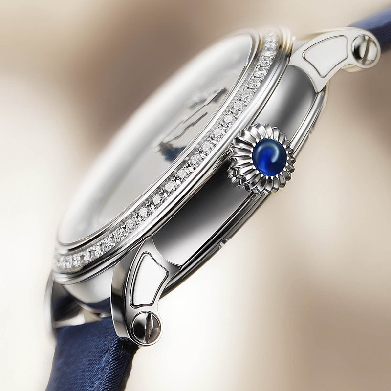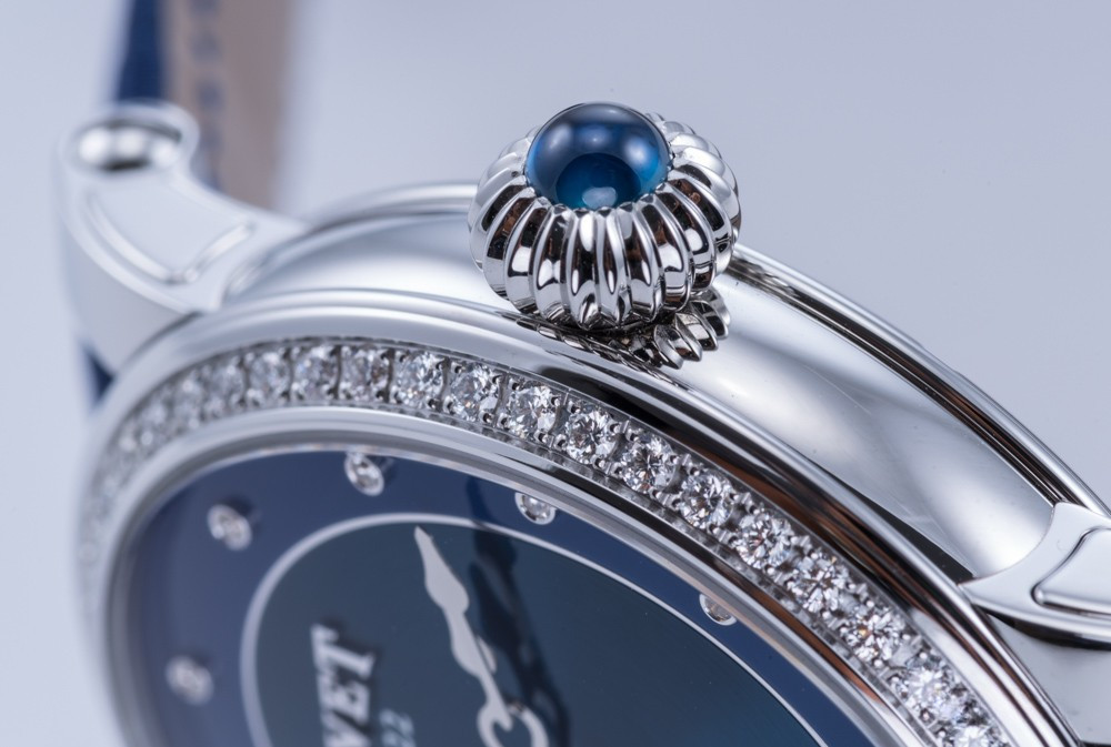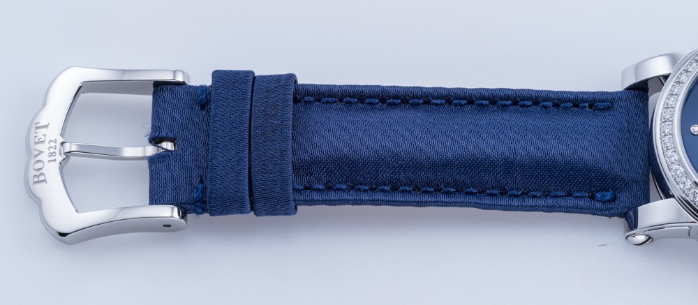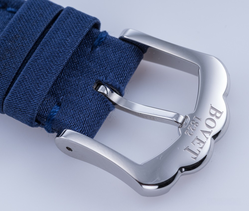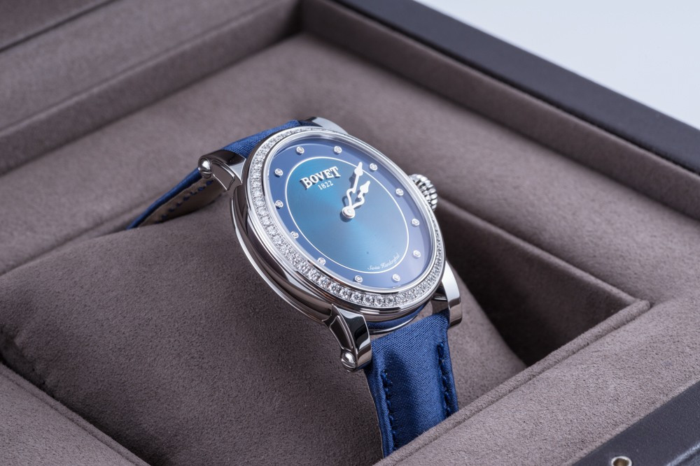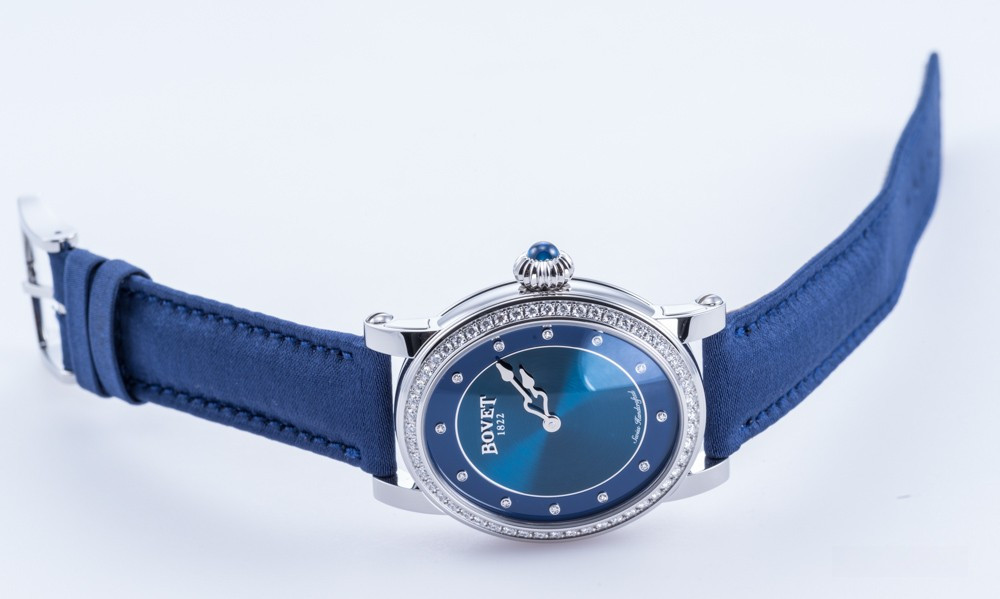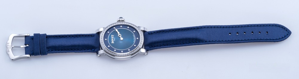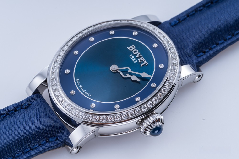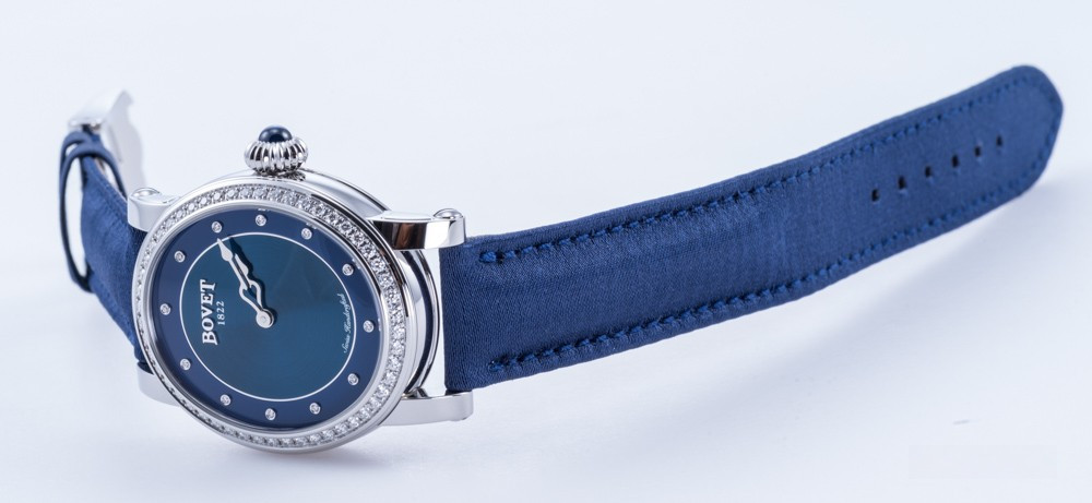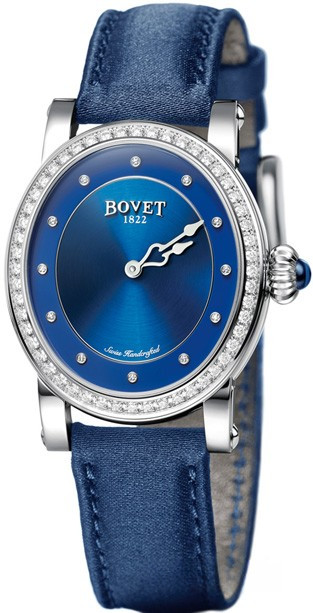 Часы Bovet Recital 19 Miss Dimier представлены в корпусе из стали, женственность которого акцентирована деликатно выполненным безелем с отделкой из 52 бриллиантов. Механизм с автоподзаводом гарантирует 3-дневный запас хода. Высокая частота механизма баланса – 28 800 пк/ч – обеспечивает безупречную точность хода часов, которую в поэтической форме подчеркивают эмблематические стрелки этой коллекции: благодаря своей необычной форме, каждый час, догоняя друг друга, они образуют сердечко. Чередование элегантных плавных линий корпуса в форме вертикального эллипса продолжается на циферблате, который разделен на две зоны, искусно декорированные мастерами мануфактуры BOVET 1822. Центр циферблата украшен в технике кругового сатинирования, на которое затем наносится PVD-покрытие, окрашивающее эту часть в синий цвет. На таким образом подготовленную поверхность накладываются, один за другим, многочисленные слои бесцветного лака традиционным ремесленным методом, который позволяет придать циферблату особую глубину. Для контрастности внешняя часть покрыта непрозрачным синим лаком и украшена 12-ю круглыми бриллиантами в оправе «шатон», которые выполняют роль часовых индексов. Часы поставляются на сатиновом ремешке с вставкой из нержавеющей стали.