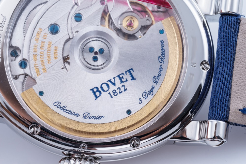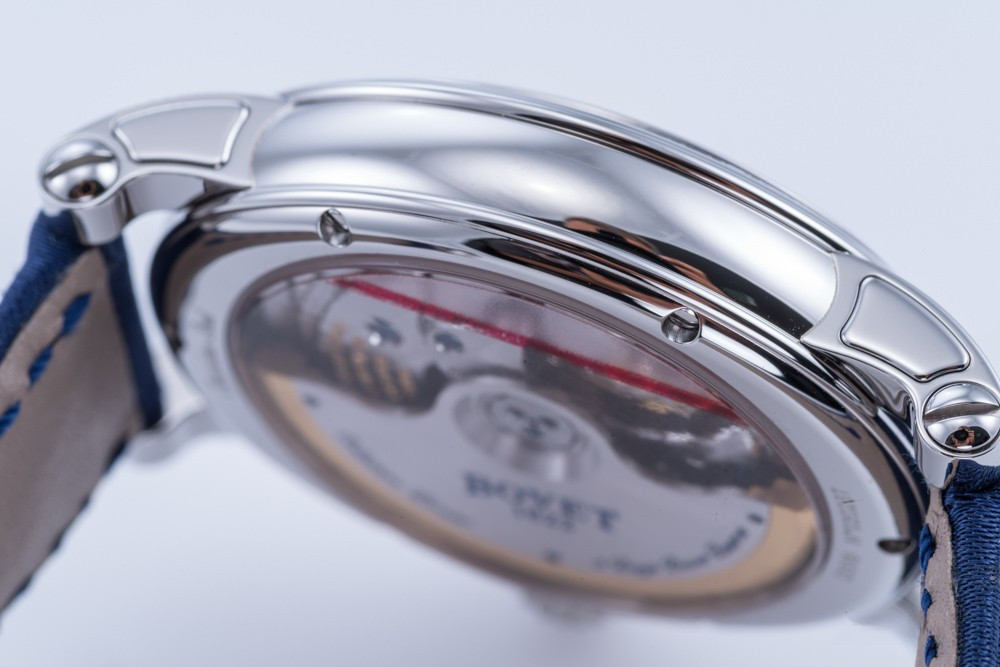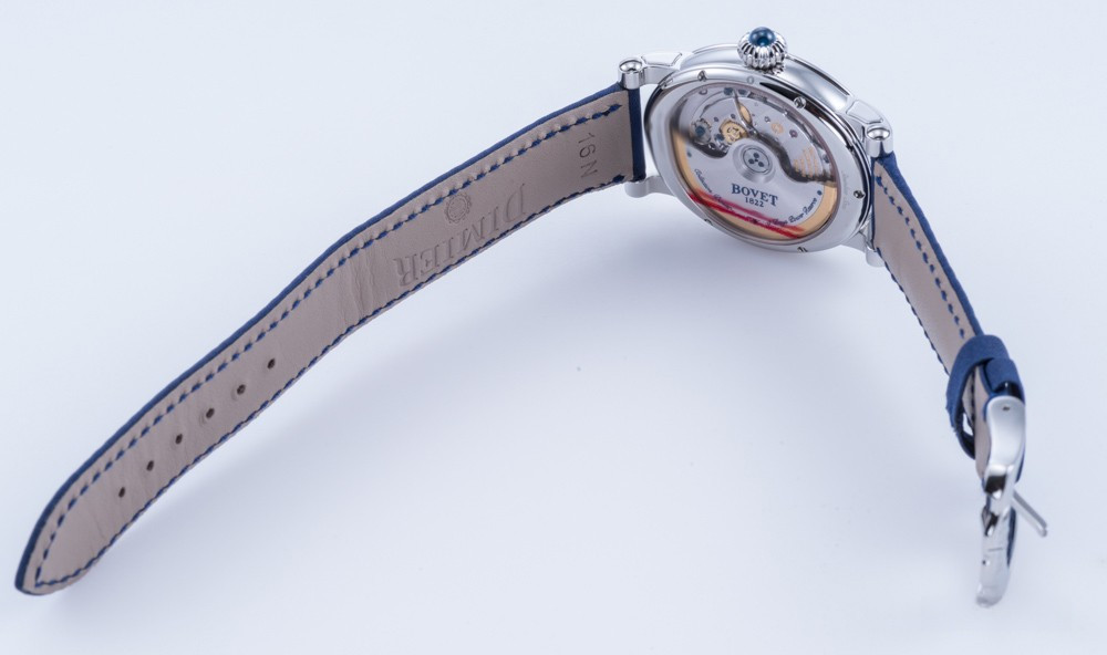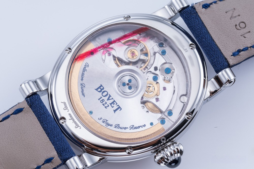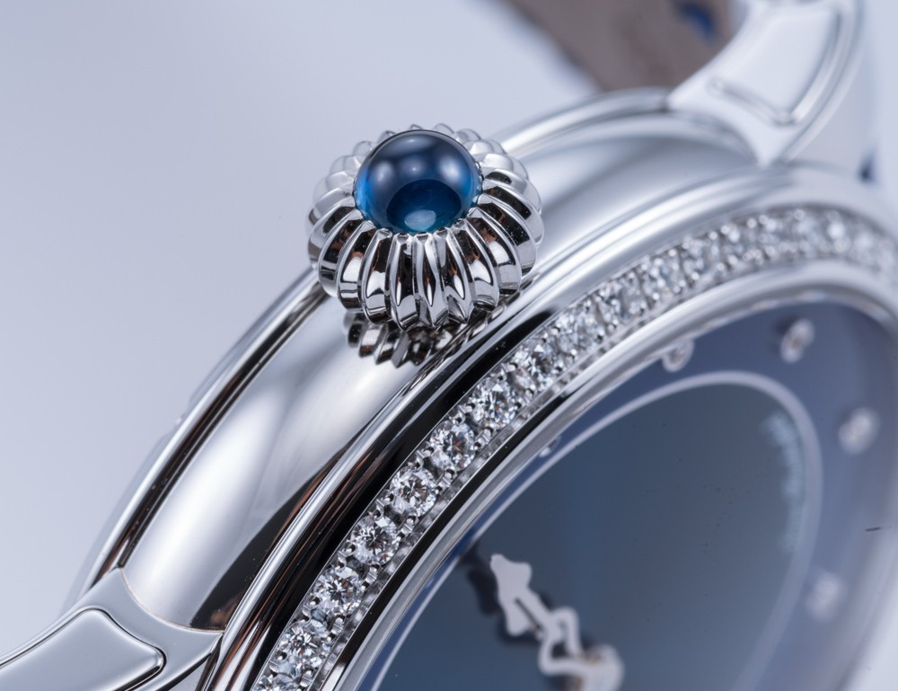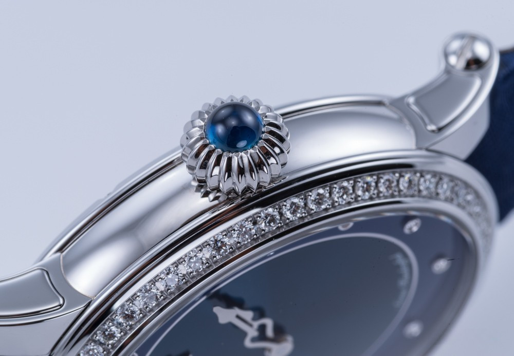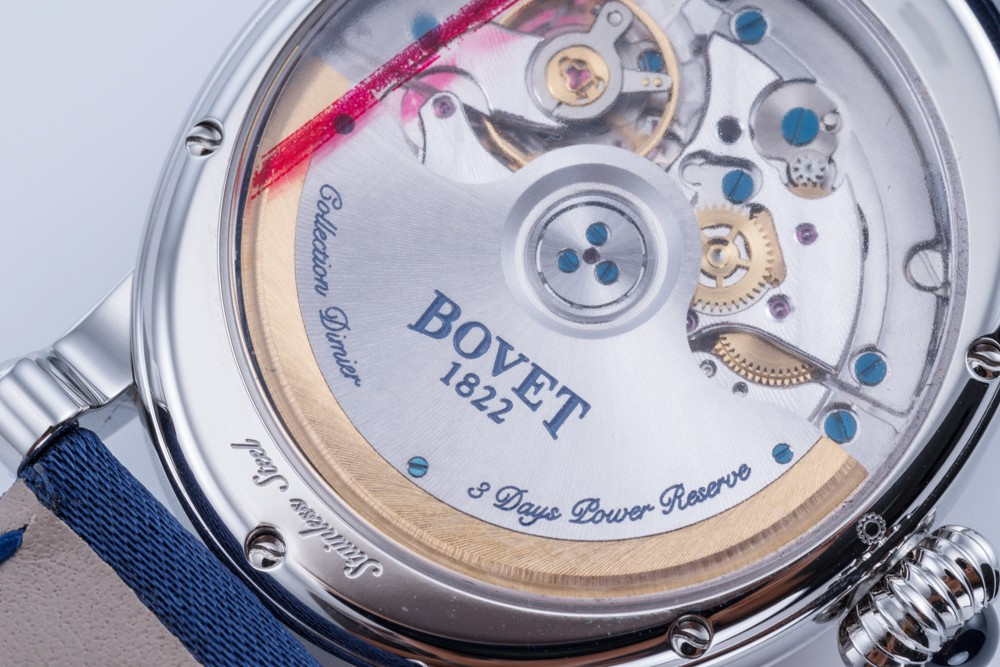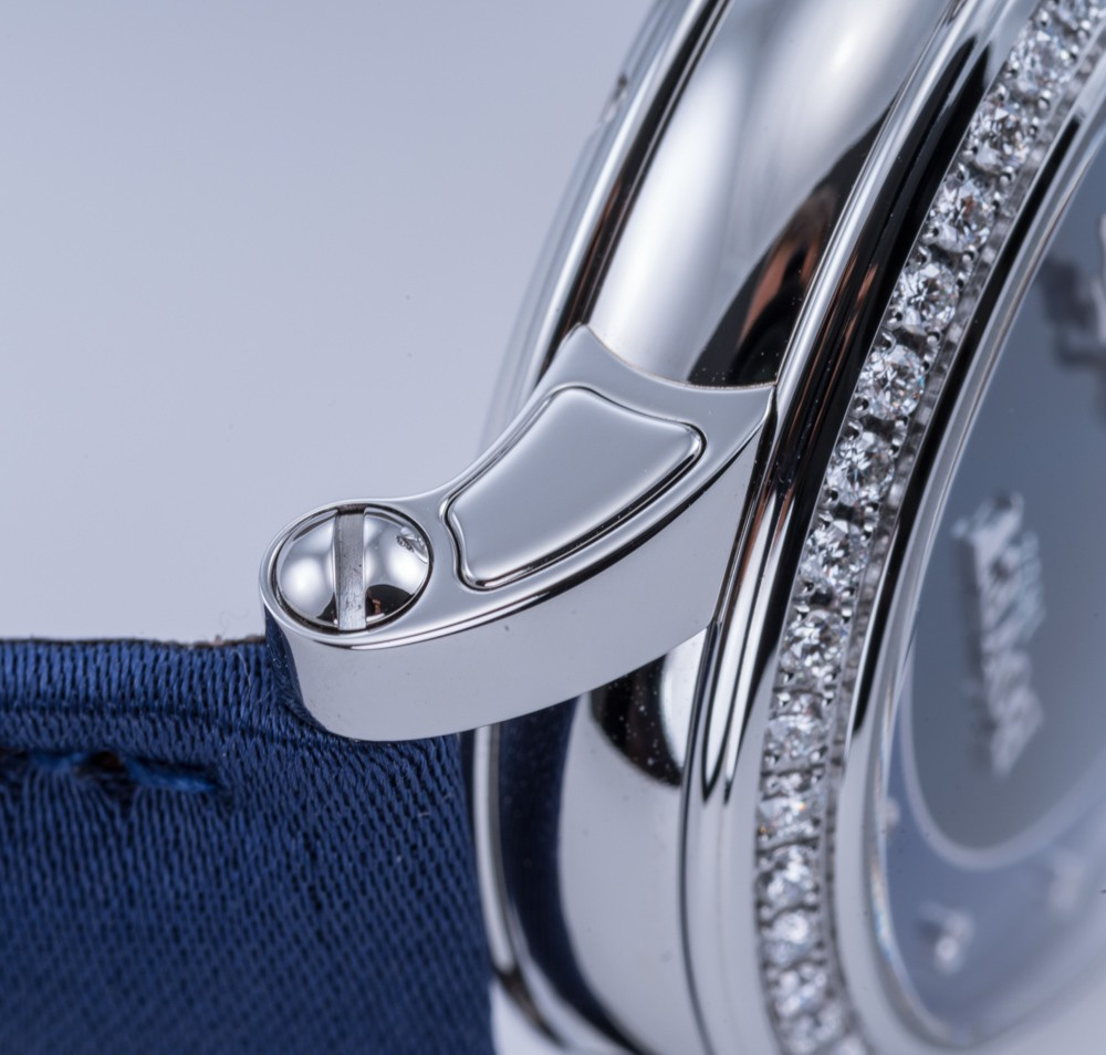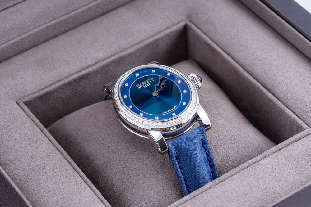 Часы Bovet Recital 19 Miss Dimier представлены в корпусе из стали, женственность которого акцентирована деликатно выполненным безелем с отделкой из 52 бриллиантов. Механизм с автоподзаводом гарантирует 3-дневный запас хода. Высокая частота механизма баланса – 28 800 пк/ч – обеспечивает безупречную точность хода часов, которую в поэтической форме подчеркивают эмблематические стрелки этой коллекции: благодаря своей необычной форме, каждый час, догоняя друг друга, они образуют сердечко. Чередование элегантных плавных линий корпуса в форме вертикального эллипса продолжается на циферблате, который разделен на две зоны, искусно декорированные мастерами мануфактуры BOVET 1822. Центр циферблата украшен в технике кругового сатинирования, на которое затем наносится PVD-покрытие, окрашивающее эту часть в синий цвет. На таким образом подготовленную поверхность накладываются, один за другим, многочисленные слои бесцветного лака традиционным ремесленным методом, который позволяет придать циферблату особую глубину. Для контрастности внешняя часть покрыта непрозрачным синим лаком и украшена 12-ю круглыми бриллиантами в оправе «шатон», которые выполняют роль часовых индексов. Часы поставляются на сатиновом ремешке с вставкой из нержавеющей стали.