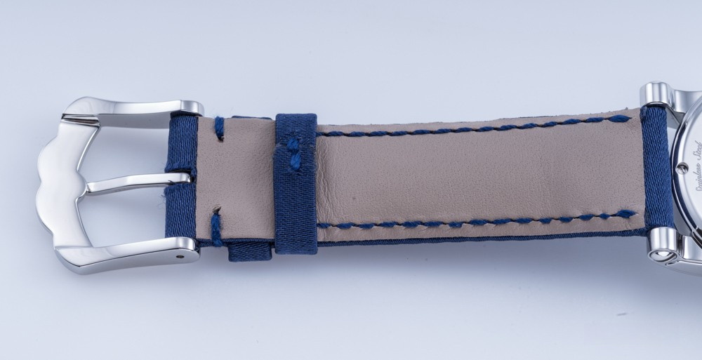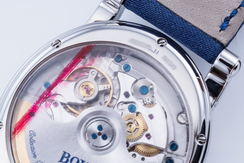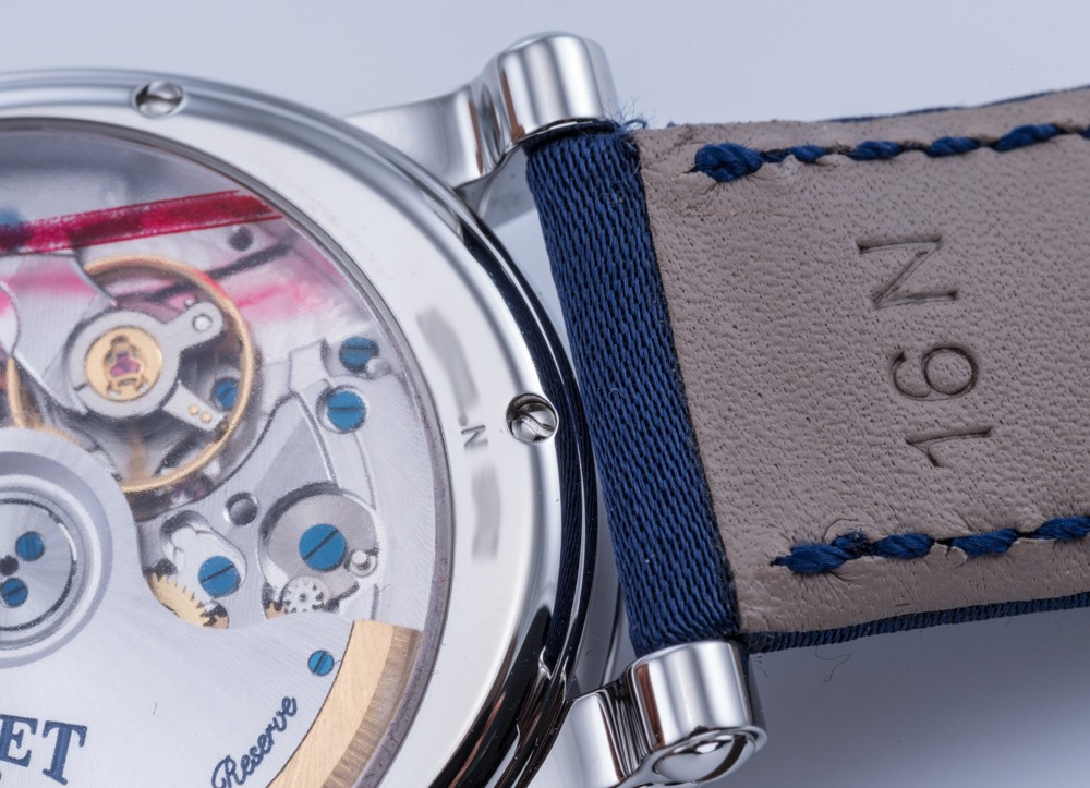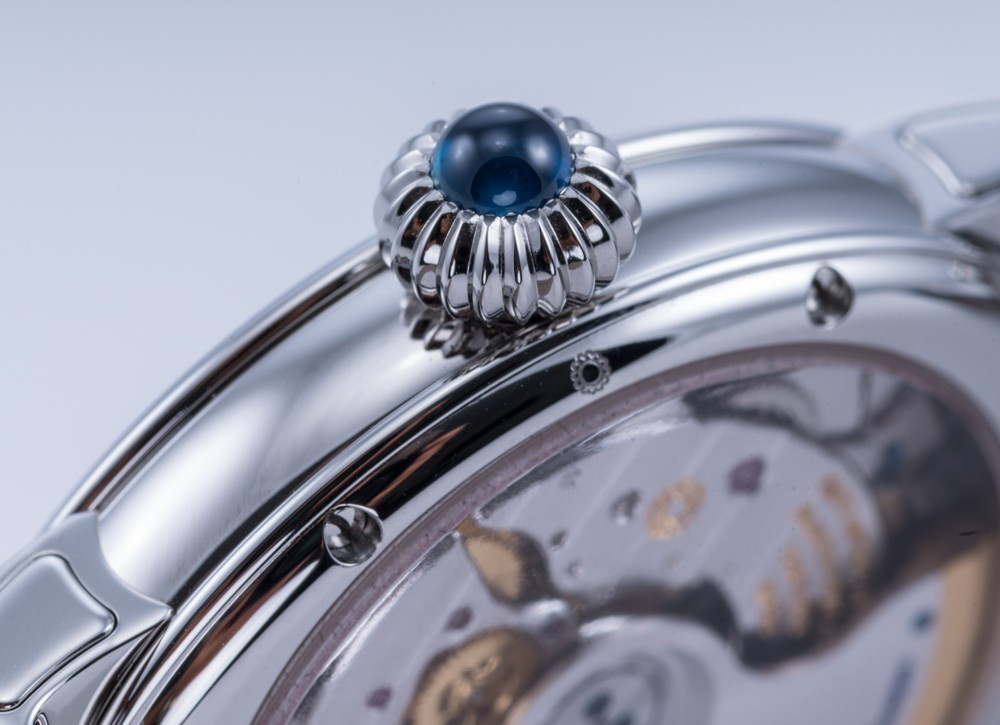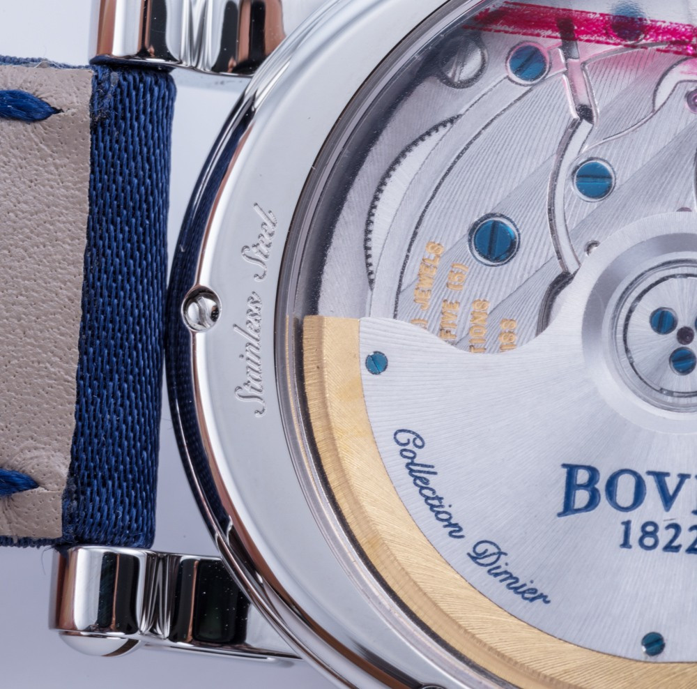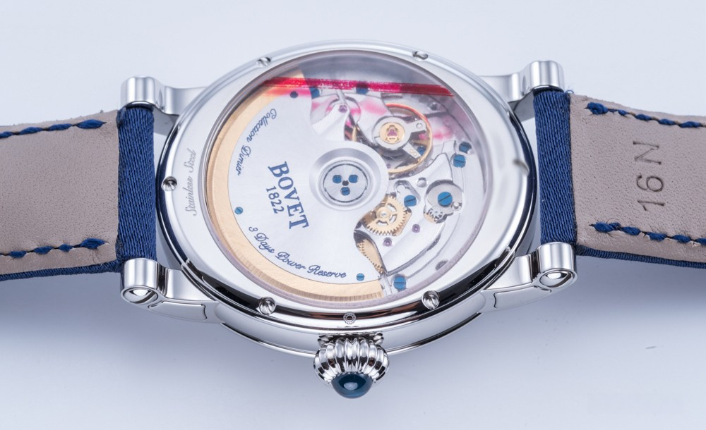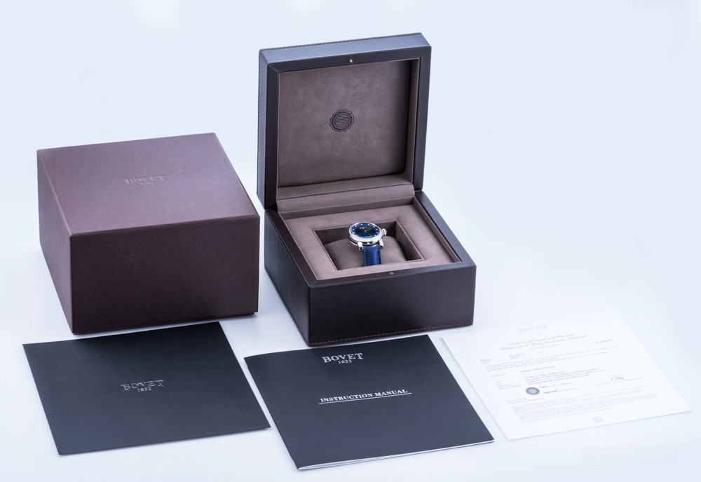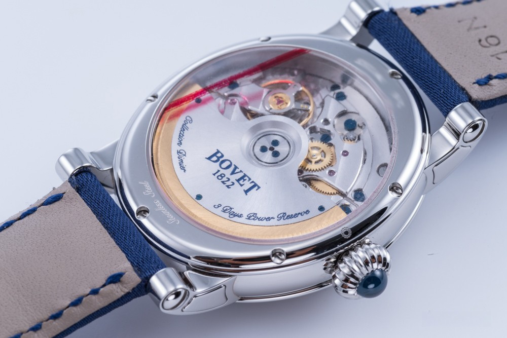 Часы Bovet Recital 19 Miss Dimier представлены в корпусе из стали, женственность которого акцентирована деликатно выполненным безелем с отделкой из 52 бриллиантов. Механизм с автоподзаводом гарантирует 3-дневный запас хода. Высокая частота механизма баланса – 28 800 пк/ч – обеспечивает безупречную точность хода часов, которую в поэтической форме подчеркивают эмблематические стрелки этой коллекции: благодаря своей необычной форме, каждый час, догоняя друг друга, они образуют сердечко. Чередование элегантных плавных линий корпуса в форме вертикального эллипса продолжается на циферблате, который разделен на две зоны, искусно декорированные мастерами мануфактуры BOVET 1822. Центр циферблата украшен в технике кругового сатинирования, на которое затем наносится PVD-покрытие, окрашивающее эту часть в синий цвет. На таким образом подготовленную поверхность накладываются, один за другим, многочисленные слои бесцветного лака традиционным ремесленным методом, который позволяет придать циферблату особую глубину. Для контрастности внешняя часть покрыта непрозрачным синим лаком и украшена 12-ю круглыми бриллиантами в оправе «шатон», которые выполняют роль часовых индексов. Часы поставляются на сатиновом ремешке с вставкой из нержавеющей стали.
