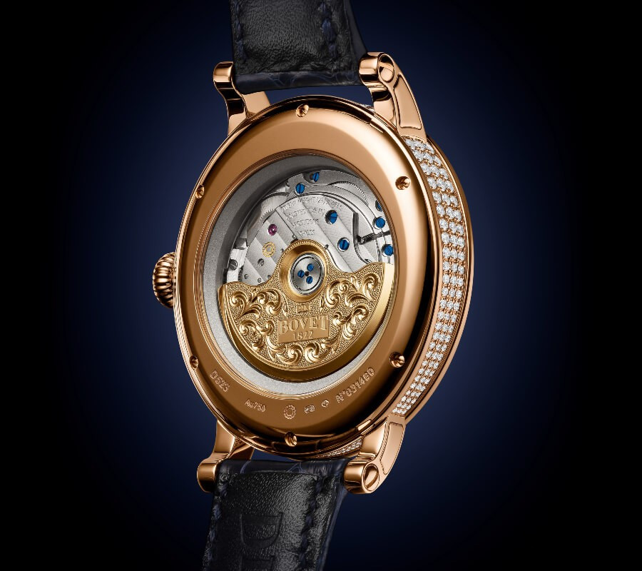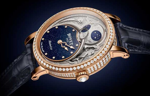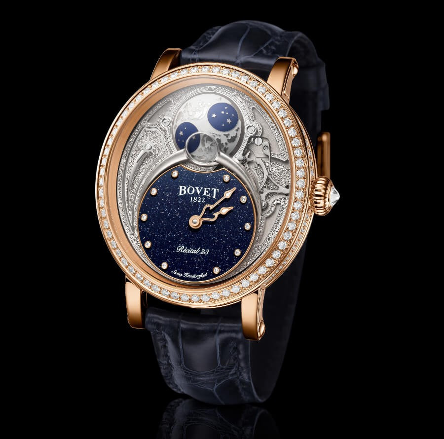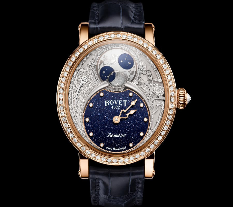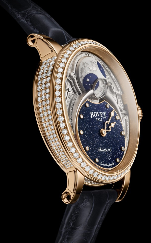 Часы Bovet Recital 23 Moon Phase представлены в корпусе из розовго золота 18к размером 43 x 28.7 х 14.4 мм и водонепроницаемостью 30 м. Внутри корпуса установлен автоматический механизм, Калибр 11DA17-MP, обладающий запасом хода 62 часа. На синем авантюриновом циферблате с 10-ю белыми бриллиантами отображаются часы, минуты, фаза луны. Часы комплектуются ремешком из кожи аллигатора с вставкой из розового золота 18к. Корпус инкрустирован белыми бриллиантами.
