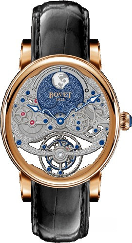 Часы Bovet Recital 9 Tourbillon Miss Alexandra выпущены в корпусе из розового золота 18к, размером 37.2 х 41 х 12.4 мм и водонепроницаемостью 30 м. Внутри корпуса установлен механизм с ручным заводом, Калибр 15BM01-MP с запасом хода 7 дней. На серебристом с синим циферблате отображаются часы, минуты, запас хода, фаза луны. Часы комплектуются ремешком из кожи аллигатора с вставкой из розового золота 18к.