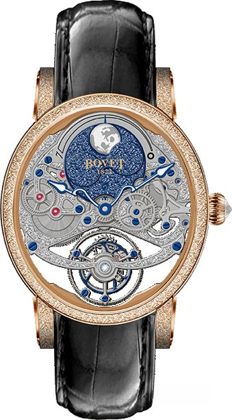 Часы Bovet Recital 9 Tourbillon Miss Alexandra выпущены в корпусе из розового золота 18к, размером 37.2 х 41 х 12.4 мм и водонепроницаемостью 30 м. Внутри корпуса установлен механизм с ручным заводом, Калибр 15BM01-MP с запасом хода 7 дней. На серебристом с синим циферблате отображаются часы, минуты, запас хода, фаза луны. Часы комплектуются ремешком из кожи аллигатора с вставкой из рзового золота 18к.