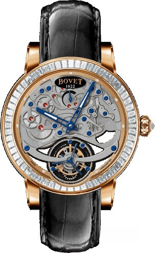 Часы Bovet Demier Recital 0 41 mm выпущены в корпусе из розового золота 18к, размером 41 мм и водонепроницаемостью 30 м. Внутри корпуса установлен механизм с ручным заводом, Калибр 15BM01 с запасом хода 7 дней. На серебристом циферблате отображаются часы, минуты, секунды, запас хода. Часы комплектуются ремешком из кожи аллигатора с вставкой из розового золота 18к. Внешний безель из 68-ми белых багетных бриллиантов общим весом 3.15 ct., внутренний безель из 9-ти белых бриллиантов 0.056 ct.