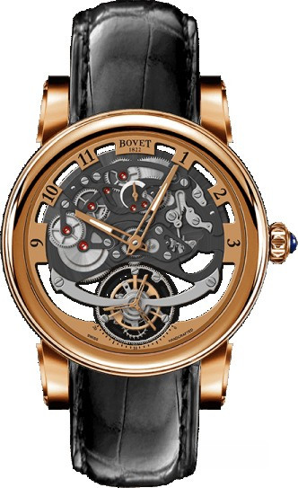 Часы Bovet Demier Recital 0 45 mm выпущены в корпусе из розового золота 18к, размером 45 мм и водонепроницаемостью 30 м. Внутри корпуса установлен механизм с ручным заводом, Калибр 15BM01 с запасом хода 7 дней. На черном циферблате отображаются часы, минуты, секунды, запас хода. Часы комплектуются ремешком из кожи аллигатора с вставкой из розового золота 18к.
