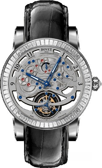 Часы Bovet Demier Recital 0 45 mm выпущены в корпусе из белого золота 18к, размером 45 мм и водонепроницаемостью 30 м. Внутри корпуса установлен механизм с ручным заводом, Калибр 15BM01 с запасом хода 7 дней. На серебристом циферблате отображаются часы, минуты, секунды, запас хода. Часы комплектуются ремешком из кожи аллигатора с вставкой из белого золота 18к. Безель из 74-х белых багетных бриллиантов общим весом 3.68 ct.