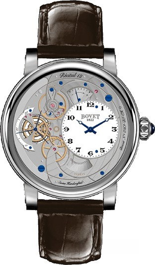 Часы Bovet Monsieur Dimier Recital 12 выпускаются в корпусе из белого золота 18к диаметром 42 мм и водонепроницаемостью до 30 метров. Внутри корпуса установлен механизм с ручным заводом, Калибр 13DM01 с функциями часов, минут, секунд и запаса хода. Линза из сапфирового стекла покрывает белый циферблат. Часы поставляются на ремешке из кожи аллигатора. Серия ограничена 100 экземплярами.