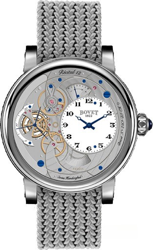Часы Bovet Monsieur Dimier Recital 12 выпускаются в корпусе из белого золота 18к диаметром 42 мм и водонепроницаемостью до 30 метров. Внутри корпуса установлен механизм с ручным заводом, Калибр 13DM01 с функциями часов, минут, секунд и запаса хода. Линза из сапфирового стекла покрывает белый циферблат. Часы поставляются на золотом браслете. Серия ограничена 100 экземплярами.