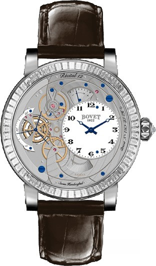 Часы Bovet Monsieur Dimier Recital 12 выпускаются в корпусе из белого золота 18к диаметром 42 мм и водонепроницаемостью до 30 метров. Внутри корпуса установлен механизм с ручным заводом, Калибр 13DM01 с функциями часов, минут, секунд и запаса хода. Линза из сапфирового стекла покрывает белый циферблат. Часы поставляются на ремешке из кожи аллигатора. Серия ограничена 100 экземплярами. Безель из 78-ми белых багетных бриллиантов общим весом 1.92 ct.