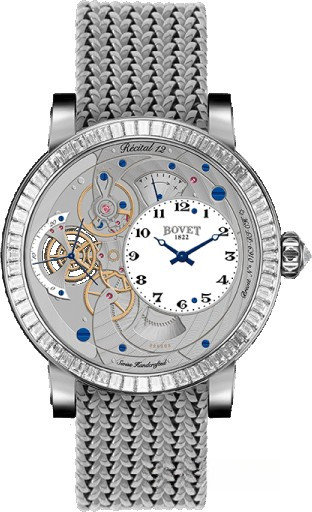 Часы Bovet Monsieur Dimier Recital 12 выпускаются в корпусе из белого золота 18к диаметром 42 мм и водонепроницаемостью до 30 метров. Внутри корпуса установлен механизм с ручным заводом, Калибр 13DM01 с функциями часов, минут, секунд и запаса хода. Линза из сапфирового стекла покрывает белый циферблат. Часы поставляются на золотом браслете. Серия ограничена 100 экземплярами. Безель из 78-ми белых багетных бриллиантов общим весом 1.92 ct.
