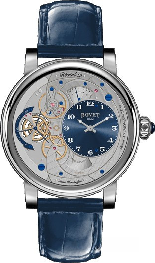 Часы Bovet Monsieur Dimier Recital 12 выпускаются в корпусе из белого золота 18к диаметром 42 мм и водонепроницаемостью до 30 метров. Внутри корпуса установлен механизм с ручным заводом, Калибр 13DM01 с функциями часов, минут, секунд и запаса хода. Линза из сапфирового стекла покрывает синий циферблат. Часы поставляются на ремешке из кожи аллигатора. Серия ограничена 100 экземплярами.