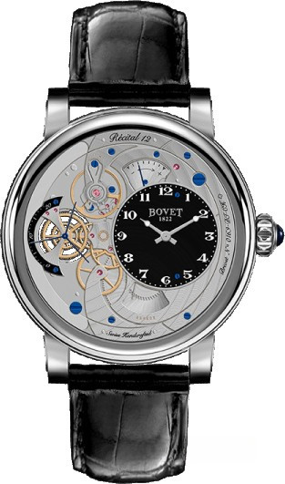 Часы Bovet Monsieur Dimier Recital 12 выпускаются в корпусе из белого золота 18к диаметром 42 мм и водонепроницаемостью до 30 метров. Внутри корпуса установлен механизм с ручным заводом, Калибр 13DM01 с функциями часов, минут, секунд и запаса хода. Линза из сапфирового стекла покрывает черный циферблат. Часы поставляются на ремешке из кожи аллигатора. Серия ограничена 100 экземплярами.