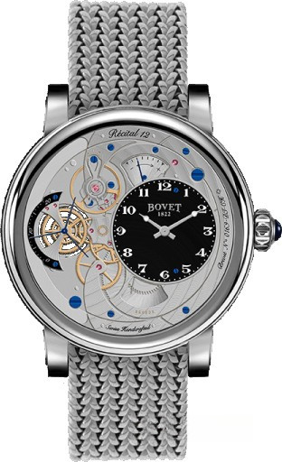 Часы Bovet Monsieur Dimier Recital 12 выпускаются в корпусе из белого золота 18к диаметром 42 мм и водонепроницаемостью до 30 метров. Внутри корпуса установлен механизм с ручным заводом, Калибр 13DM01 с функциями часов, минут, секунд и запаса хода. Линза из сапфирового стекла покрывает черный циферблат. Часы поставляются на золотом браслете. Серия ограничена 100 экземплярами.