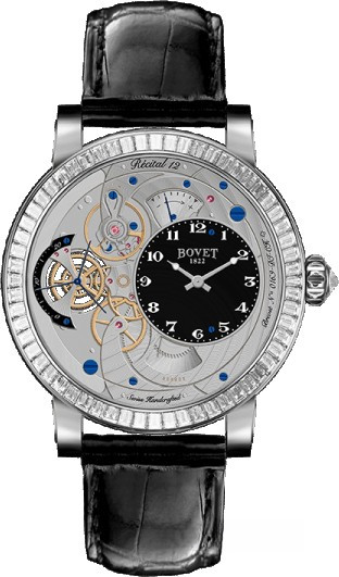 Часы Bovet Monsieur Dimier Recital 12 выпускаются в корпусе из белого золота 18к диаметром 42 мм и водонепроницаемостью до 30 метров. Внутри корпуса установлен механизм с ручным заводом, Калибр 13DM01 с функциями часов, минут, секунд и запаса хода. Линза из сапфирового стекла покрывает черный циферблат. Часы поставляются на ремешке из кожи аллигатора. Серия ограничена 100 экземплярами. Безель из 78-ми белых багетных бриллиантов общим весом 1.92 ct.
