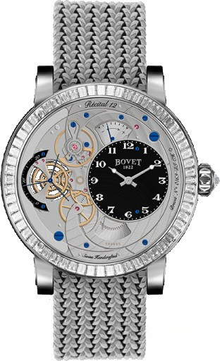 Часы Bovet Monsieur Dimier Recital 12 выпускаются в корпусе из белого золота 18к диаметром 42 мм и водонепроницаемостью до 30 метров. Внутри корпуса установлен механизм с ручным заводом, Калибр 13DM01 с функциями часов, минут, секунд и запаса хода. Линза из сапфирового стекла покрывает черный циферблат. Часы поставляются на золотом браслете. Серия ограничена 100 экземплярами. Безель из 78-ми белых багетных бриллиантов общим весом 1.92 ct.
