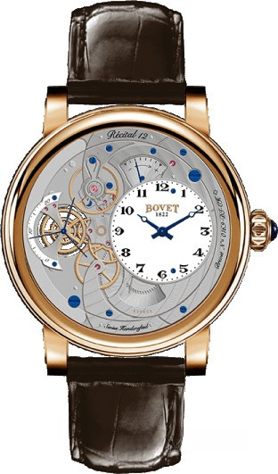 Часы Bovet Monsieur Dimier Recital 12 выпускаются в корпусе из розового золота 18к диаметром 42 мм и водонепроницаемостью до 30 метров. Внутри корпуса установлен механизм с ручным заводом, Калибр 13DM01 с функциями часов, минут, секунд и запаса хода. Линза из сапфирового стекла покрывает белый циферблат. Часы поставляются на ремешке из кожи аллигатора. Серия ограничена 100 экземплярами.