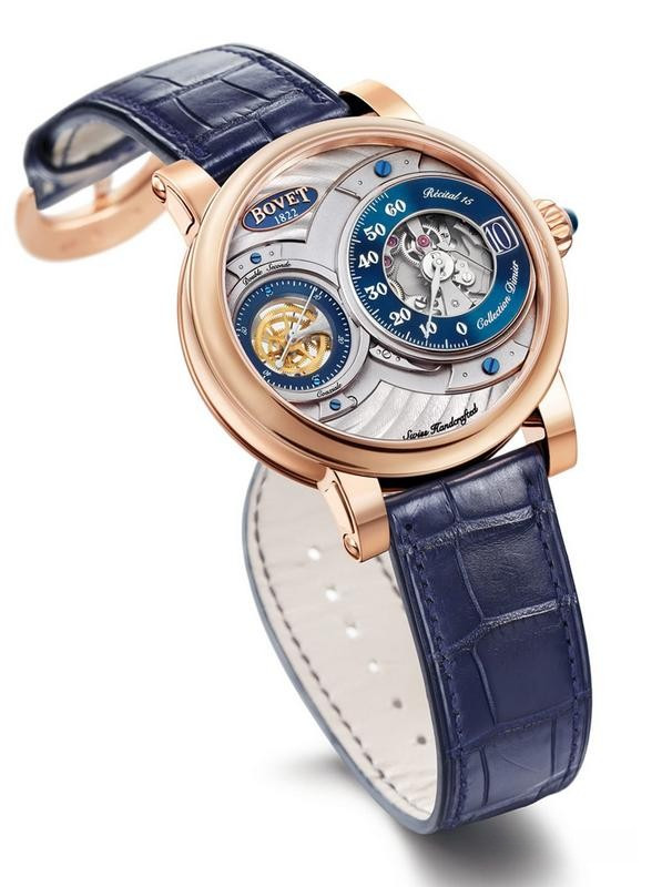 Мужские часы Bovet Dimier Recital 15 оснащены механизмом с ручным заводом, Калибр 13DM02-AIHSMR с запасом хода 5 дней. Диаметр корпуса 42 мм. Корпус часов изготовлен из 18-каратного розового золота. Циферблат синего цвета. Ремешок из кожи аллигатора, в комплекте — цепь из розового золота для ношения как карманные часы. Водонепроницаемы до 30 м. Функции: часы, минуты, секунды, индикатор запаса хода. Часы выпущены ограниченной серией 100 штук.
