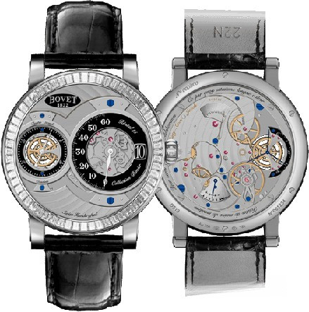 Мужские часы Bovet Dimier Recital 15 оснащены механизмом с ручным заводом, Калибр 13DM02-AIHSMR с запасом хода 5 дней. Диаметр корпуса 42 мм. Корпус часов изготовлен из 18-каратного белого золота. Циферблат черного цвета. Ремешок из кожи аллигатора, в комплекте — цепь из белого золота для ношения как карманные часы. Водонепроницаемы до 30 м. Функции: часы, минуты, секунды, индикатор запаса хода. Часы выпущены ограниченной серией 100 штук. Безель из 64-х белых багетных бриллиантов общим весом 3.25 ct.
