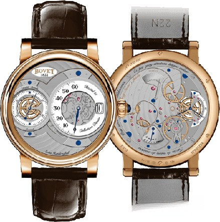 Мужские часы Bovet Dimier Recital 15 оснащены механизмом с ручным заводом, Калибр 13DM02-AIHSMR с запасом хода 5 дней. Диаметр корпуса 42 мм. Корпус часов изготовлен из 18-каратного розового золота. Циферблат белого цвета. Ремешок из кожи аллигатора, в комплекте — цепь из розового золота для ношения как карманные часы. Водонепроницаемы до 30 м. Функции: часы, минуты, секунды, индикатор запаса хода. Часы выпущены ограниченной серией 100 штук.